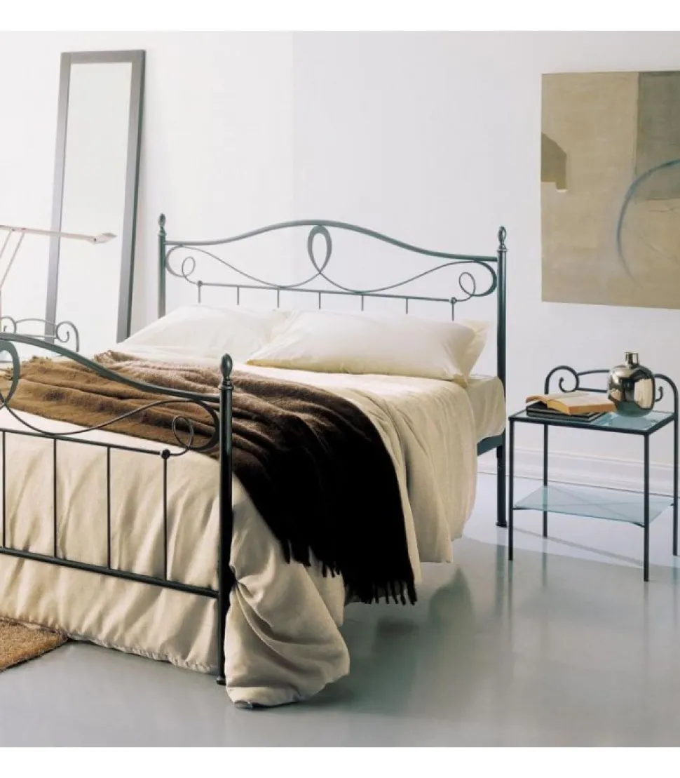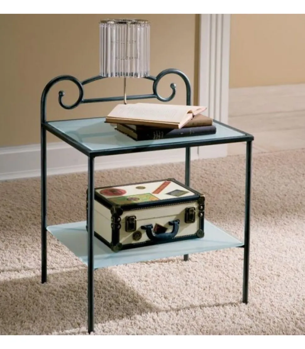 Algardi, Comodino In Ferro Laccato O Patinato A Mano, Con Piani In Cristallo Sabbiato. Prodotto Di Ingenia Bontempi, 100% Made In Italy.