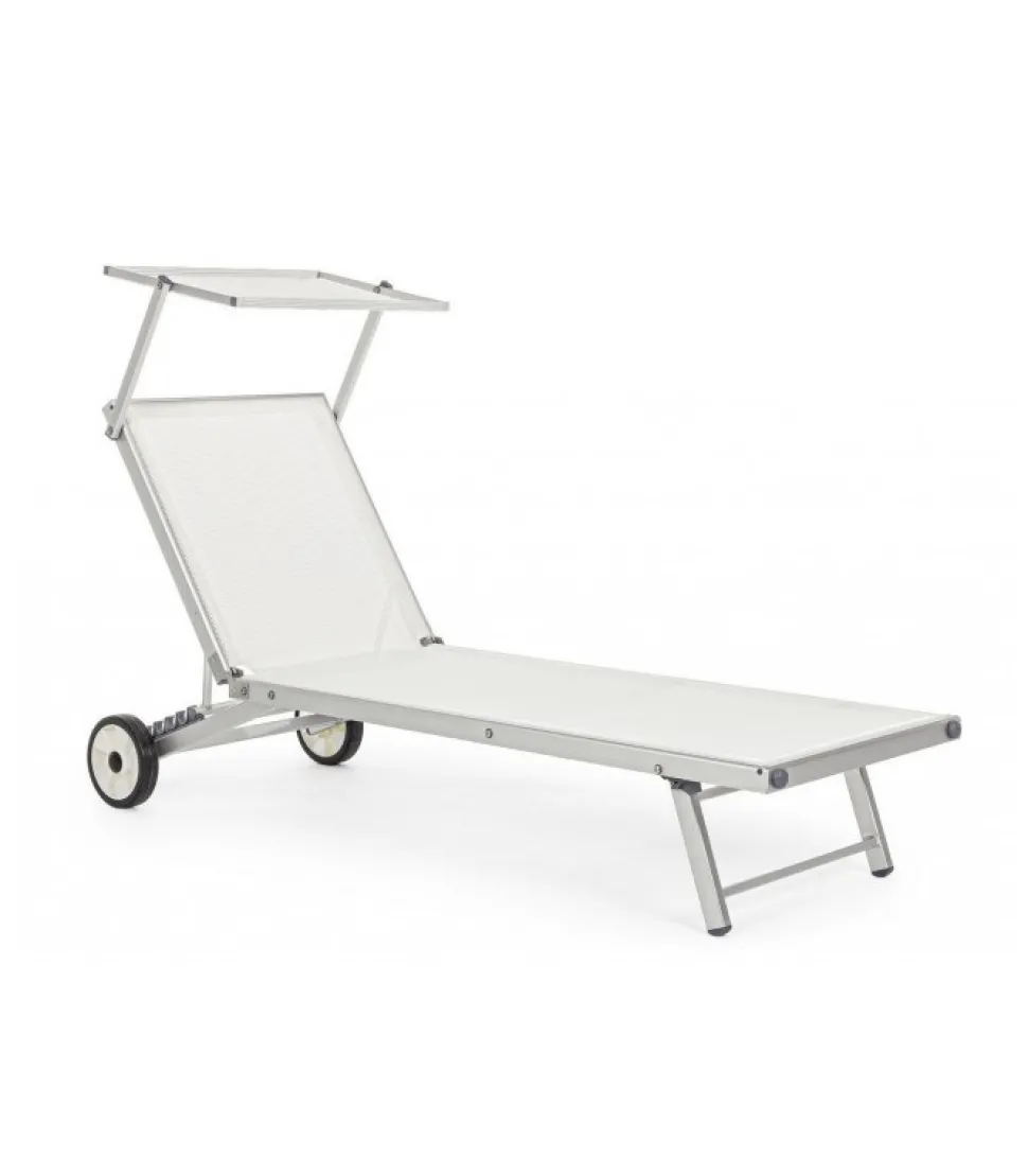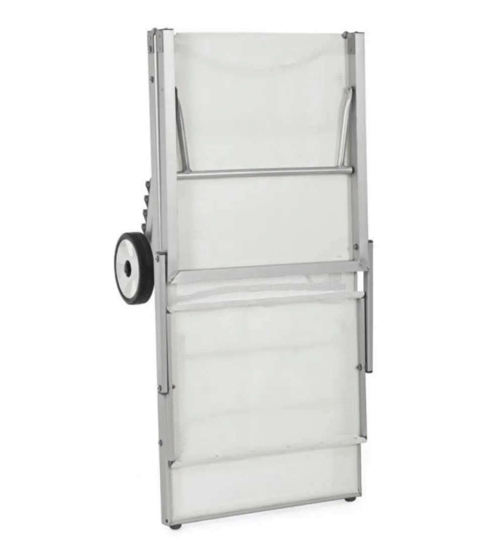 Lettino Cross C-Ruote Bianco Struttura In Alluminio Anodizzato 42X30X1.2Mm/40X23X1.2Mm. Tessuto In Textilene 4X4 660Gr/M2. Quattro Posizioni. Pieghevole. Ruote Da Assemblare. – Dimensioni In Cm. 65 (L.) 196 (P.) 62 ( H.) 32 ( H1)