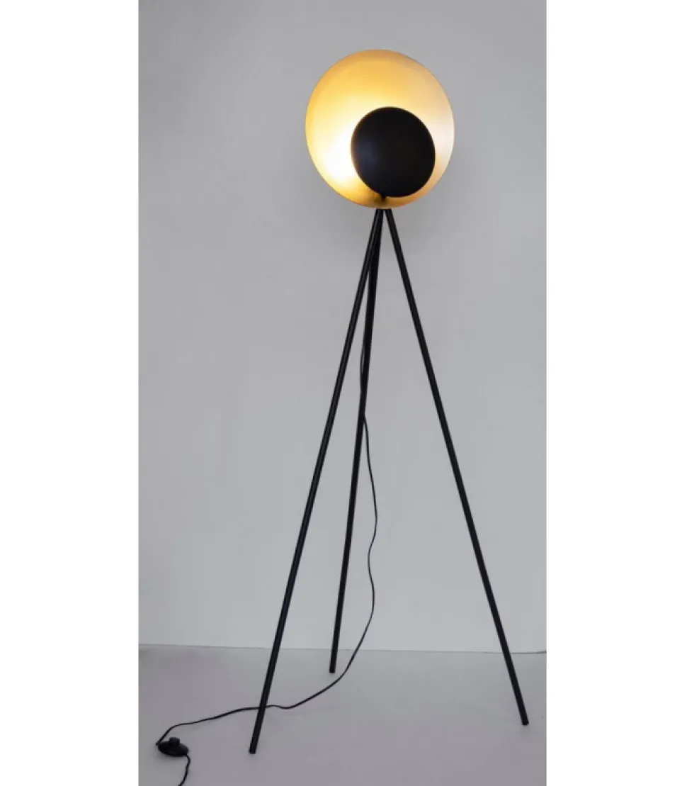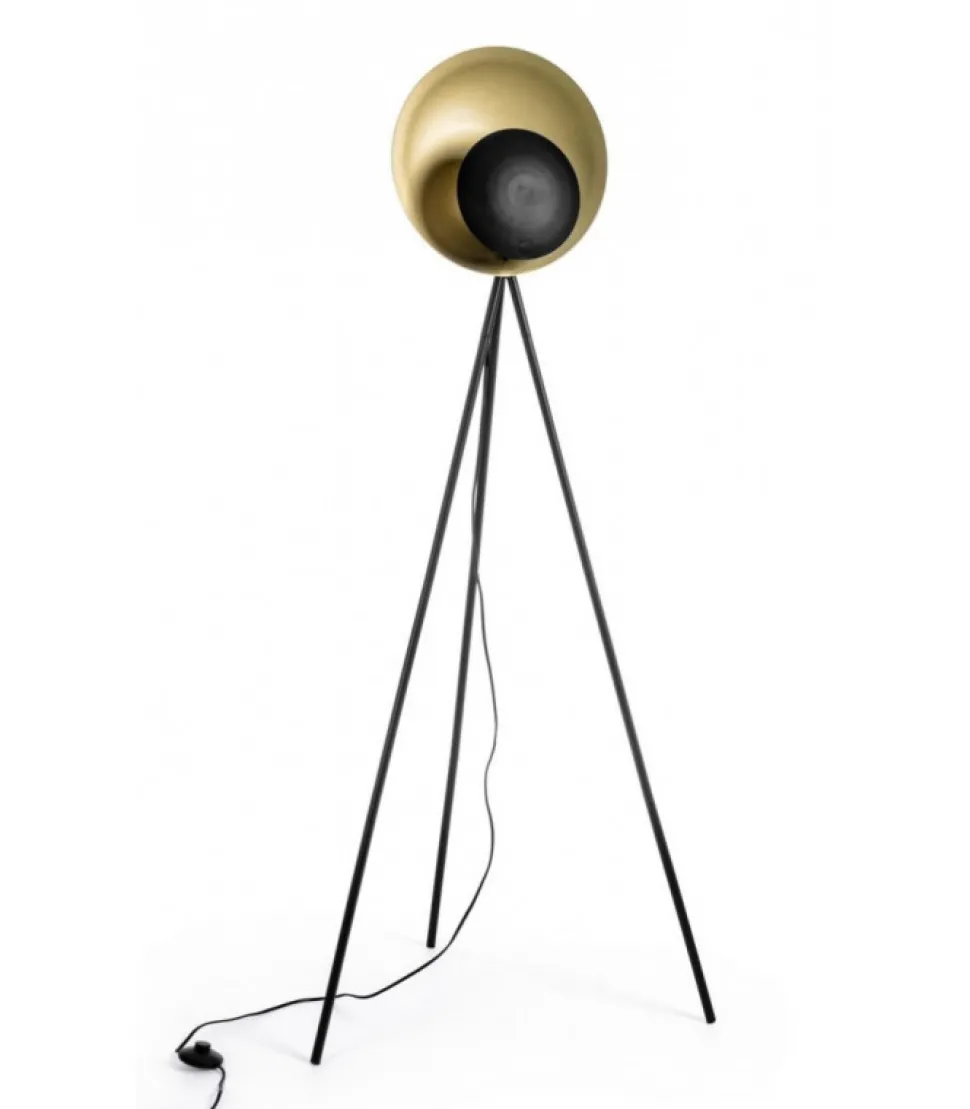 Piantana Design Treppiede Nero-Oro H156 Acciaio Verniciato A Polvere Epossidica. Lamp. E27 Max 60W, E27 11W Comp. Fluor Integr. Risp. En., E27 42W Alog. Risp. En. Lampadina/E Non Inclusa/E. Lunghezza Totale Cavo 3Mt. Distanza Tra Lampada E Interruttore: 180 Cm. Da Assemblare – Dimensioni In Cm. 87X56X155 H