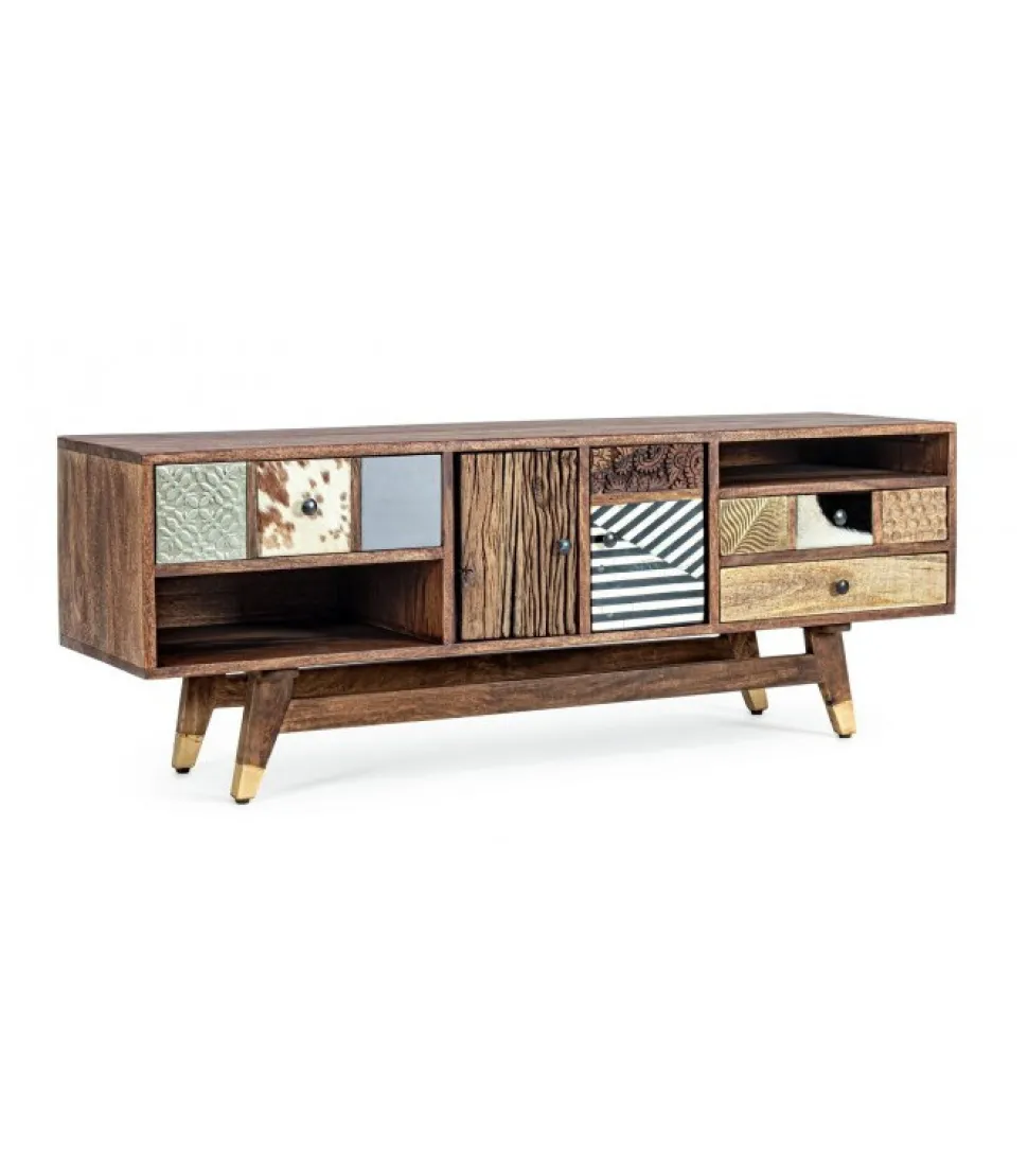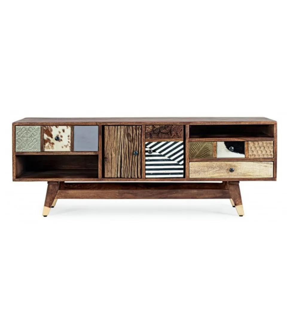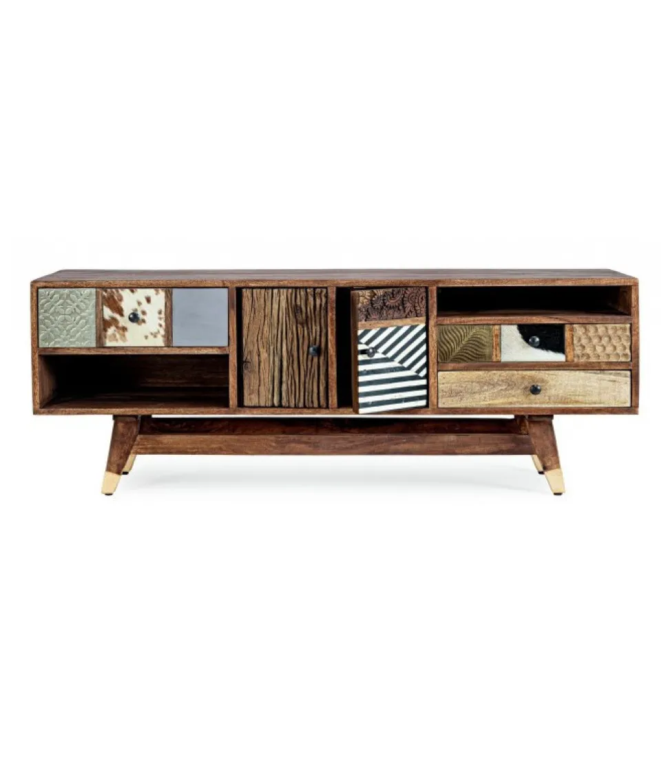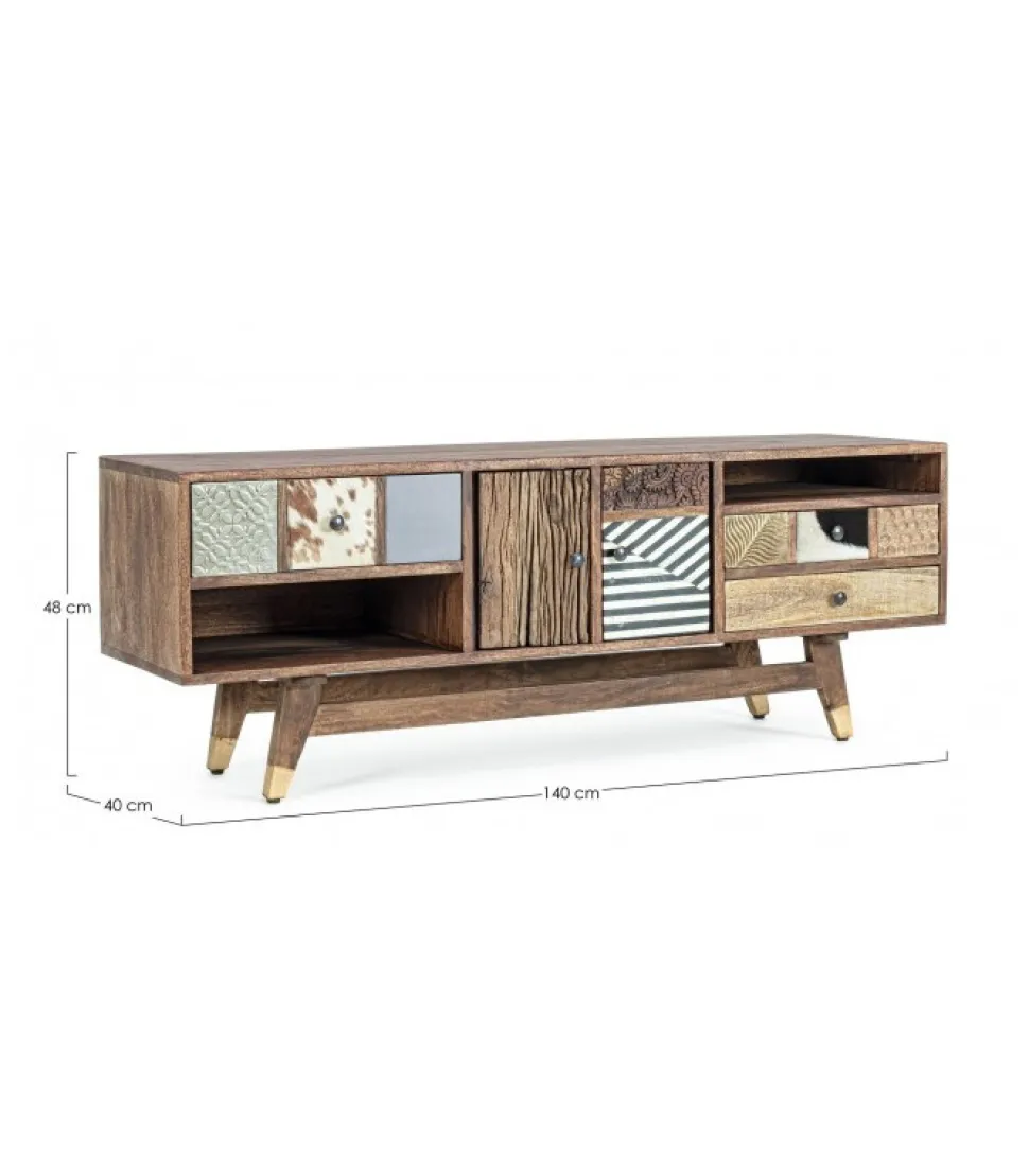 Mobile Porta Tv Dhaval Struttura In Legno Di Mango, Schienale In Mdf. Frontale Ante E Cassetti In Legno Riciclato Mango Ed Acacia Con Applicazioni In Metallo E Pelle. Struttura Cassetti In Mango Ed Acacia. Finitura Con Vernice A Base D’Acqua. Maniglie In Acciaio. Gambe Da Assemblare. – Dimensioni In Cm. 140 (L.) 40 (P.) 48 H