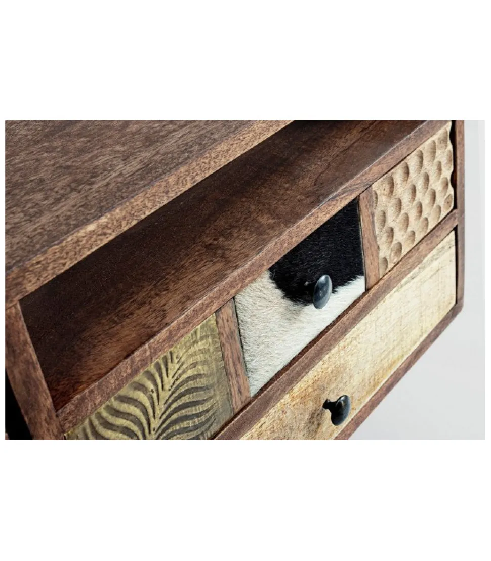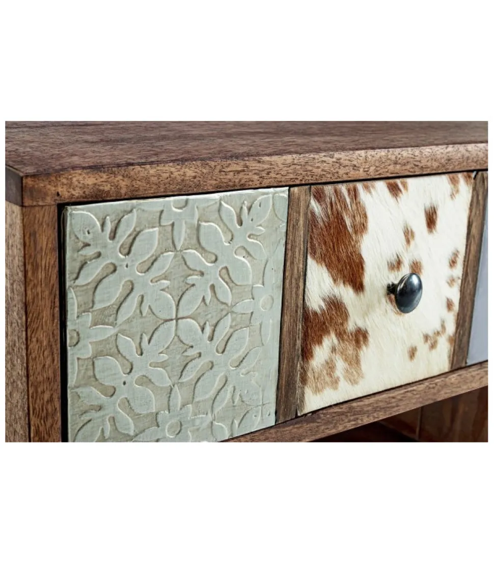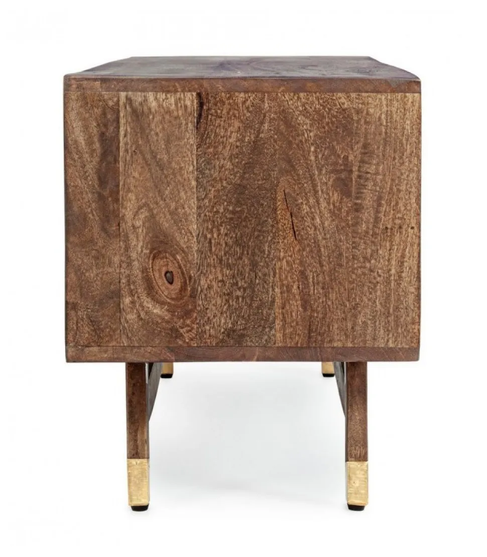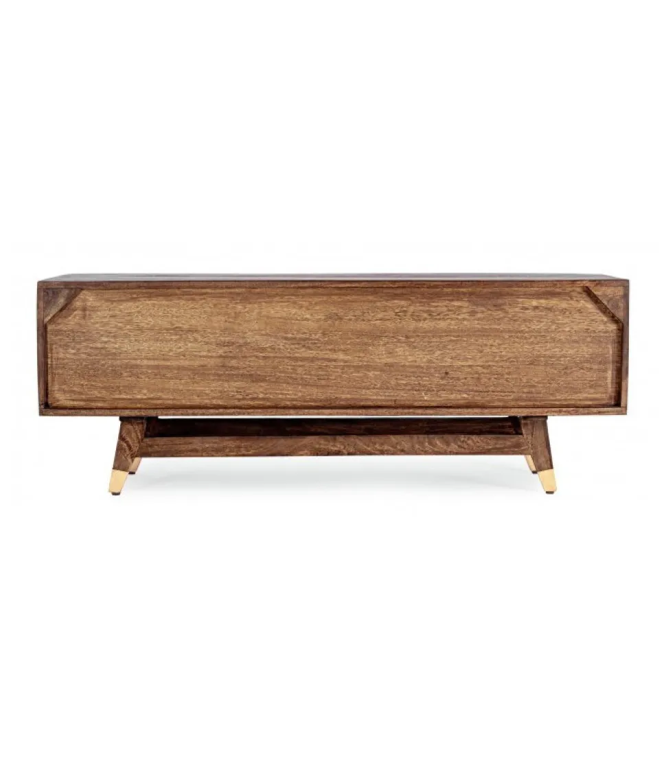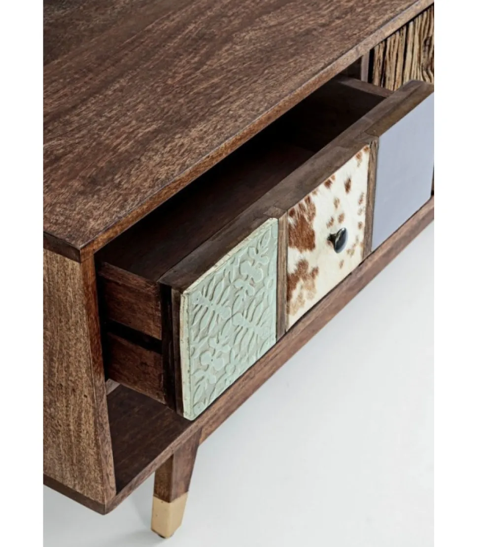 Mobile Porta Tv Dhaval Struttura In Legno Di Mango, Schienale In Mdf. Frontale Ante E Cassetti In Legno Riciclato Mango Ed Acacia Con Applicazioni In Metallo E Pelle. Struttura Cassetti In Mango Ed Acacia. Finitura Con Vernice A Base D’Acqua. Maniglie In Acciaio. Gambe Da Assemblare. – Dimensioni In Cm. 140 (L.) 40 (P.) 48 H