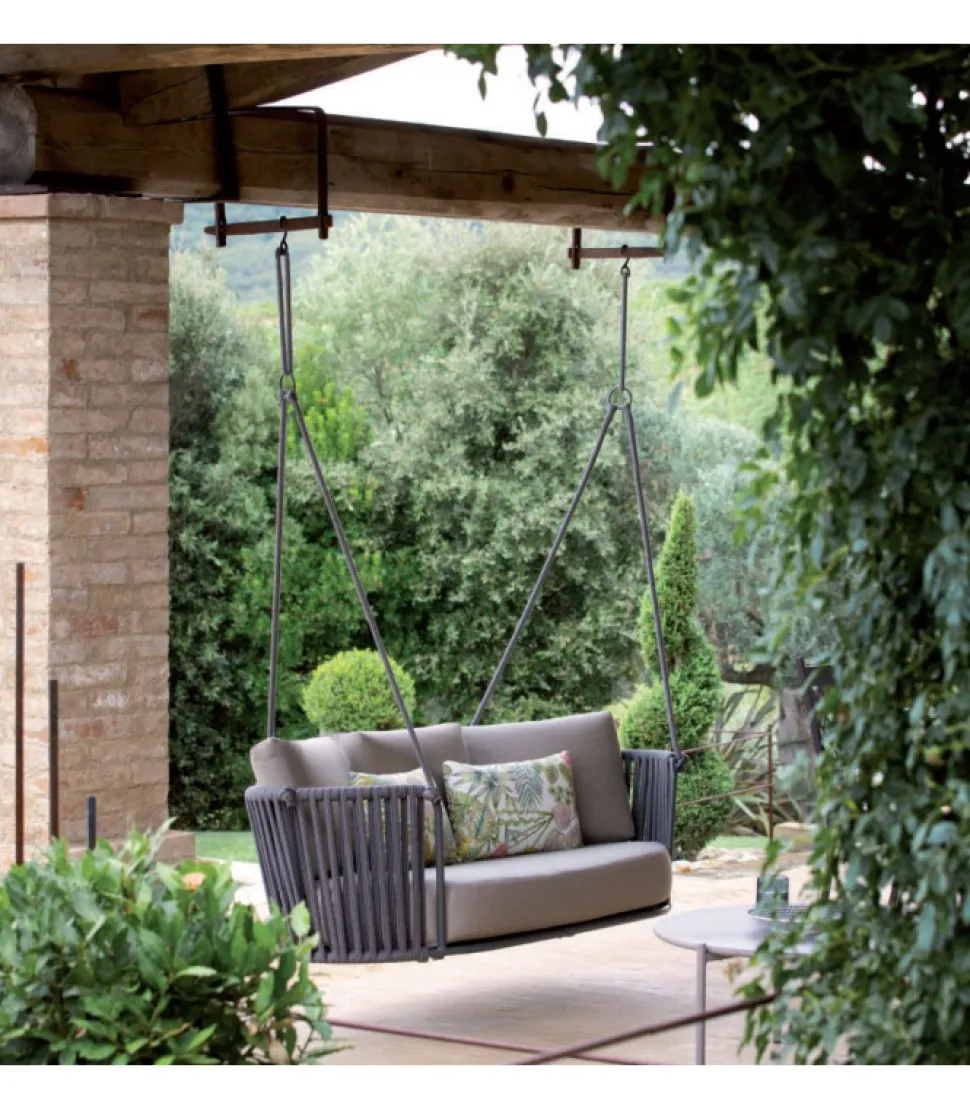 Altalena Daisy Rope Al, Con Struttura In Metallo Disponibile In Molte Finiture Diverse, Con Schienale In Corda, E Dotato Di Cuscino Per La Seduta.