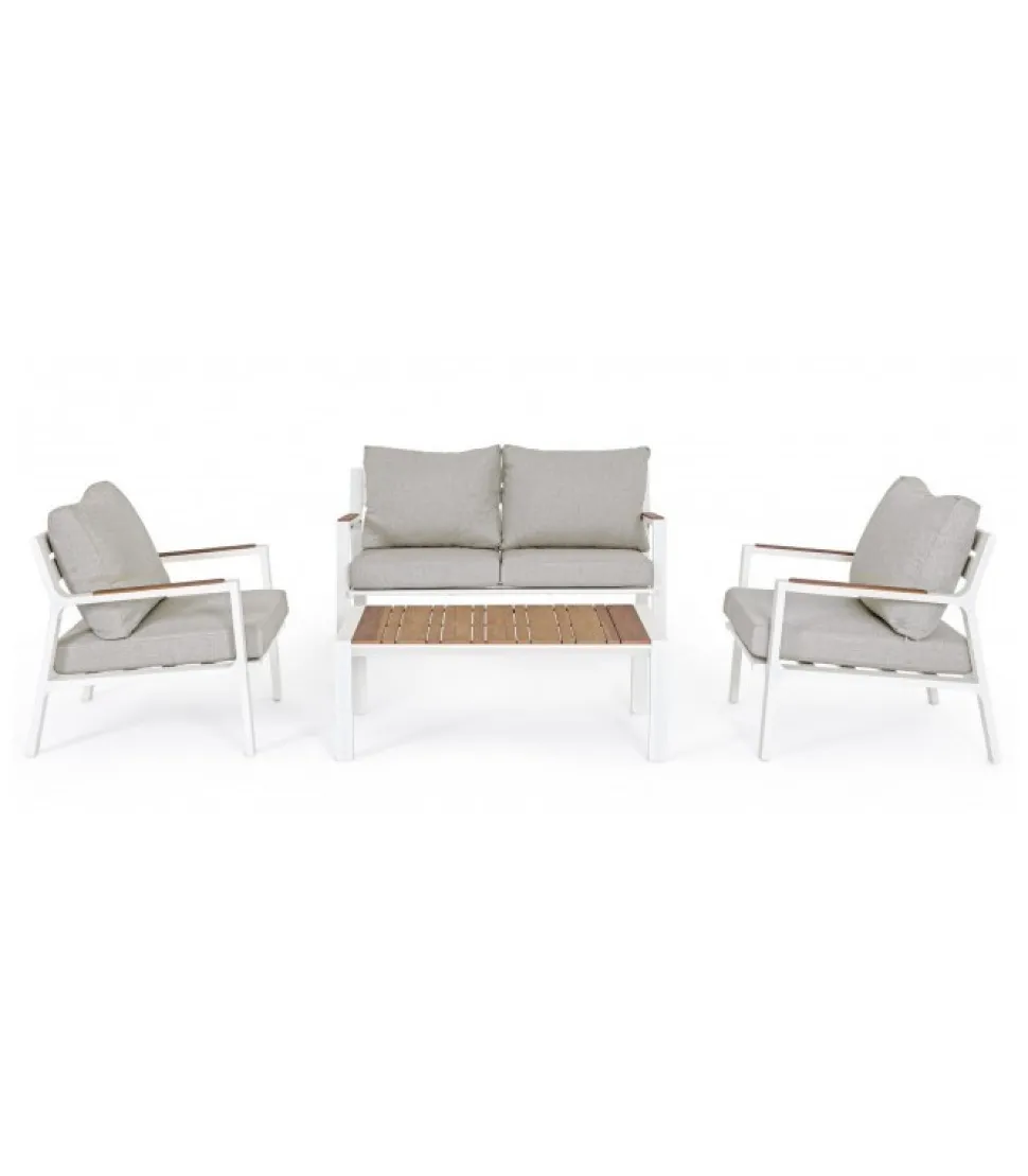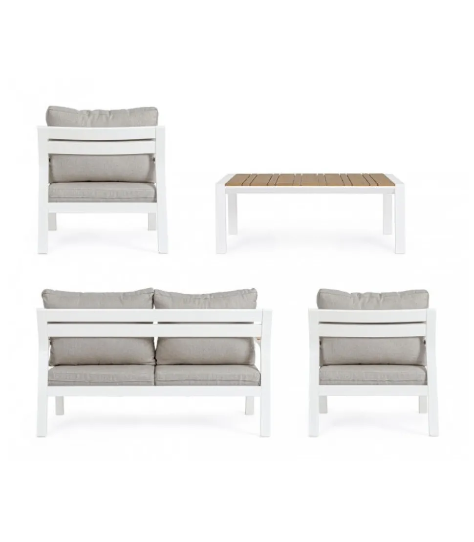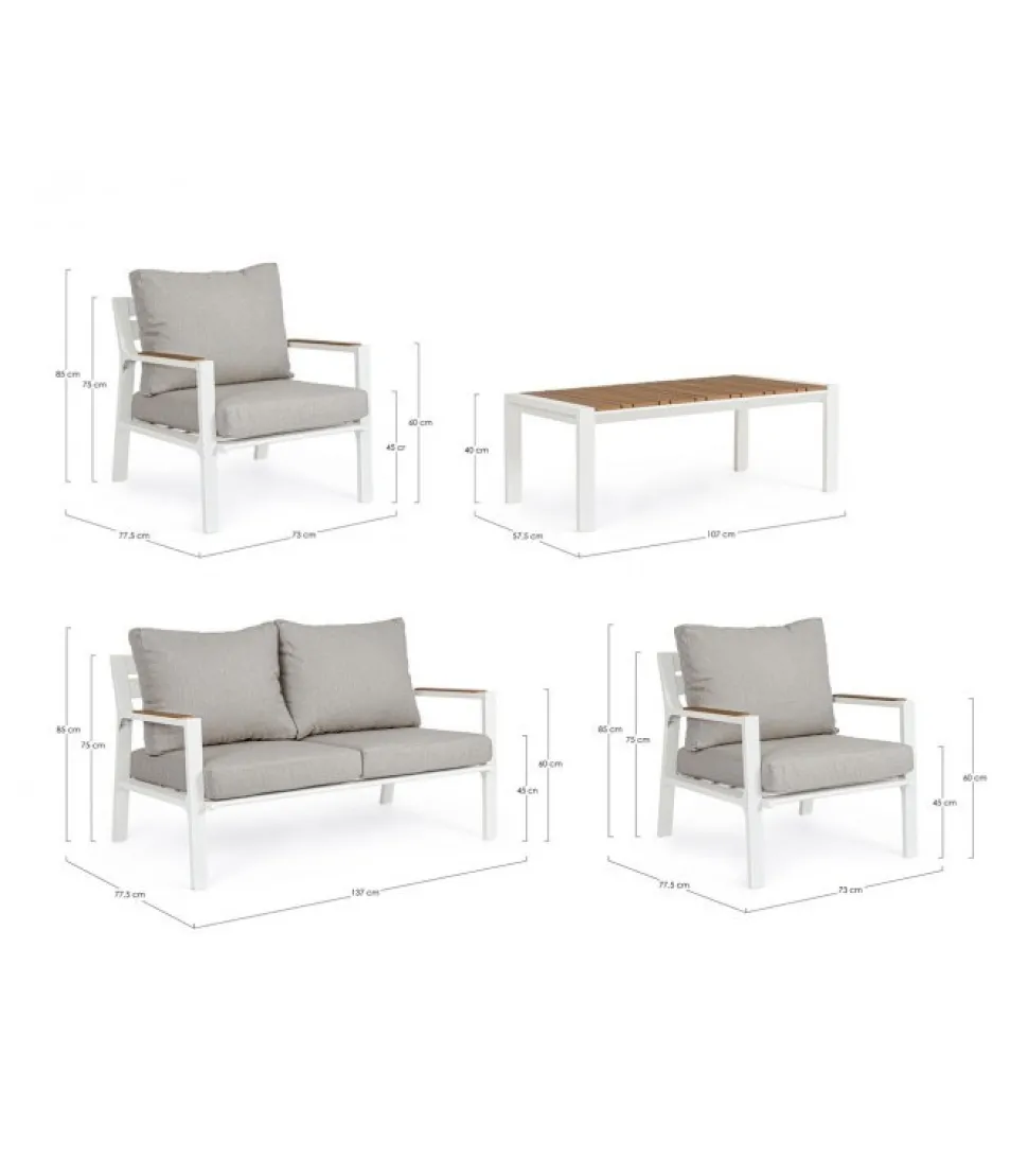 Set4 Salotto C-C Ernst Bianco Sj60 Struttura In Alluminio Verniciato A Polvere (Poliestere). Braccioli E Piano Tavolino In Polywood (Materiale Composito Dall’Aspetto Simile Al Legno) 90% Polistirene 10% Sbs Color Teak. Cuscini Sfoderabili Con Tessuto In Poliestere. Viteria In Acciaio Galvanizzato. Da Assemblare. – Dimensioni In Cm. A 73 (L.) 77.5 (P.) 85 H – 45 ( H1) 60 ( H2) 75 H3 / B 137 (L.) 77.5 (P.) 85 H – 45 ( H1) 60 ( H2) 75 H3/ C 107 (L.) 57.5 (P.) 40 H