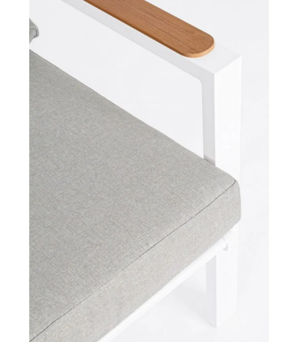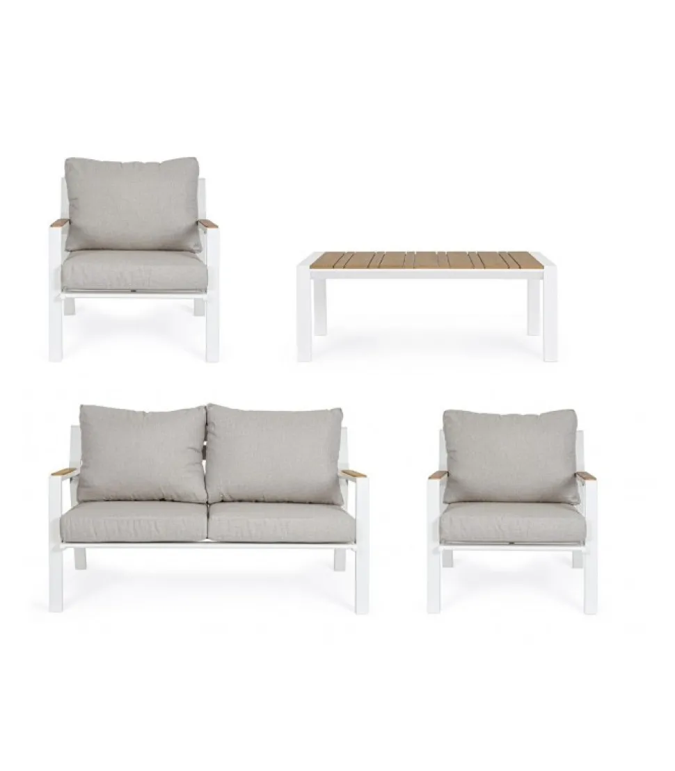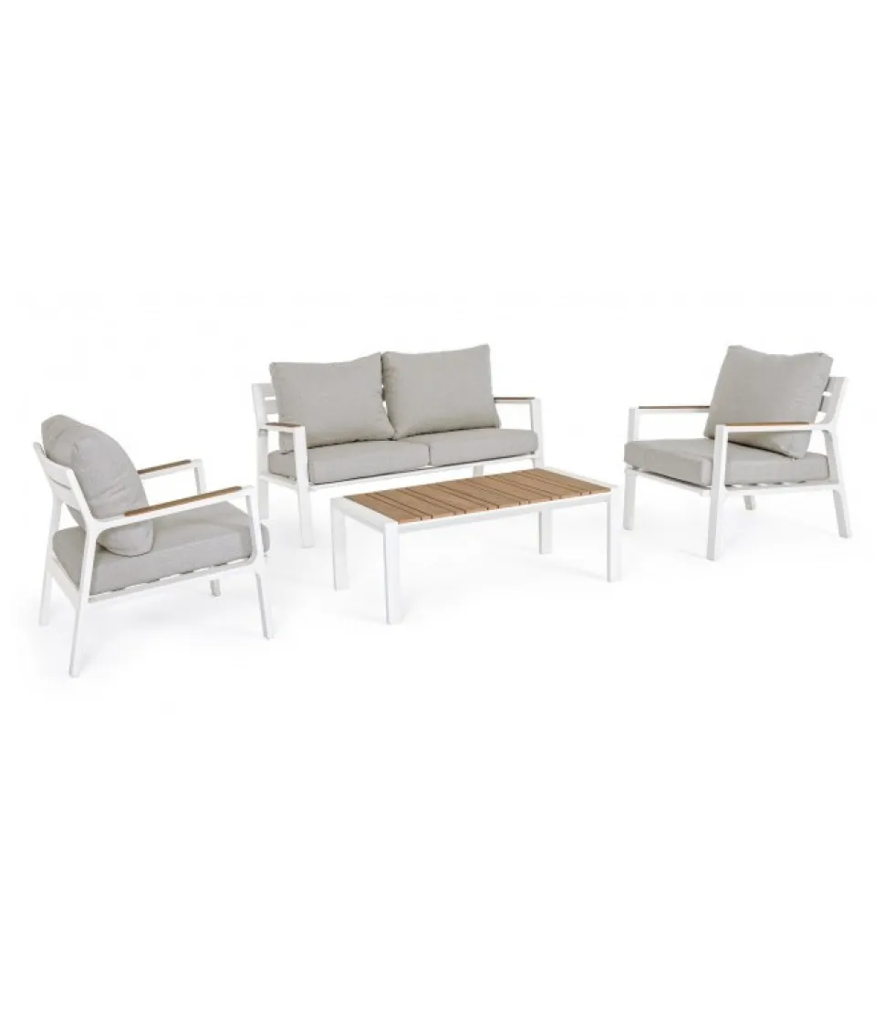 Set4 Salotto C-C Ernst Bianco Sj60 Struttura In Alluminio Verniciato A Polvere (Poliestere). Braccioli E Piano Tavolino In Polywood (Materiale Composito Dall’Aspetto Simile Al Legno) 90% Polistirene 10% Sbs Color Teak. Cuscini Sfoderabili Con Tessuto In Poliestere. Viteria In Acciaio Galvanizzato. Da Assemblare. – Dimensioni In Cm. A 73 (L.) 77.5 (P.) 85 H – 45 ( H1) 60 ( H2) 75 H3 / B 137 (L.) 77.5 (P.) 85 H – 45 ( H1) 60 ( H2) 75 H3/ C 107 (L.) 57.5 (P.) 40 H