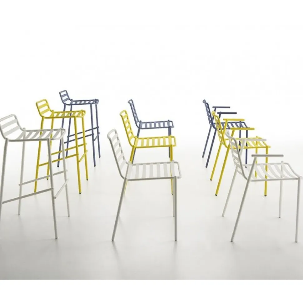 Sgabello Fisso Disponibile In 2 Altezze, Realizzato In Acciaio Trattato E Verniciato Per Esterni In Varie Finiture, Dai Piu Classici E Sobri Bianco E Nero, Ai Colori Piu Vivaci Come Rosso E Giallo, Passando Dal Grigio Cielo, Colorato Ed Elegante.