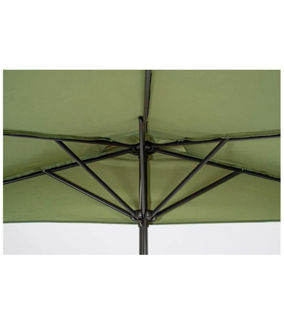 Ombrellone Kalife Mezzaluna 2.7 Olive Struttura Verniciata A Polvere (Poliestere). Palo In Alluminio O36/38Mm. 5 Stecche In Acciaio Trattato Per Esterno Tramite Fosfatazione 12X18Mm. Telo In Poliestere Color Oliva 160Gr/M2 Con Camino Antivento. Base Non Inclusa – Dimensioni In Cm. 270 (L.) 135 (P.) 232 H