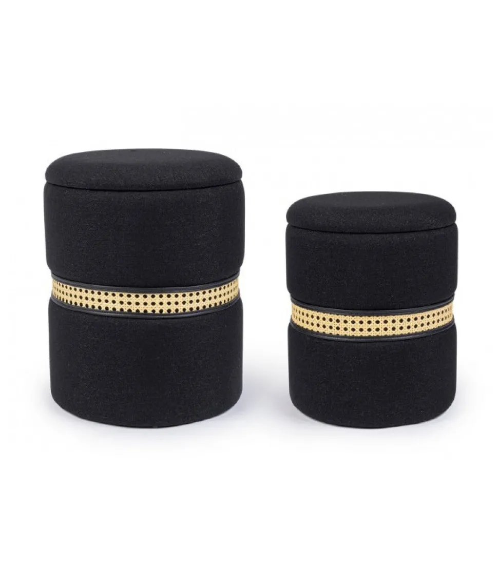 Set2 Pouf Contenitore Karina Nero Struttura In Mdf E Compensato. Rivestimento In Poliestere. Con Decorazione In Similpelle (Pu) E Rattan Sintetico. – Dimensioni In Cm. O31.5 (L.) 40 H; O36 (L.) 44 H
