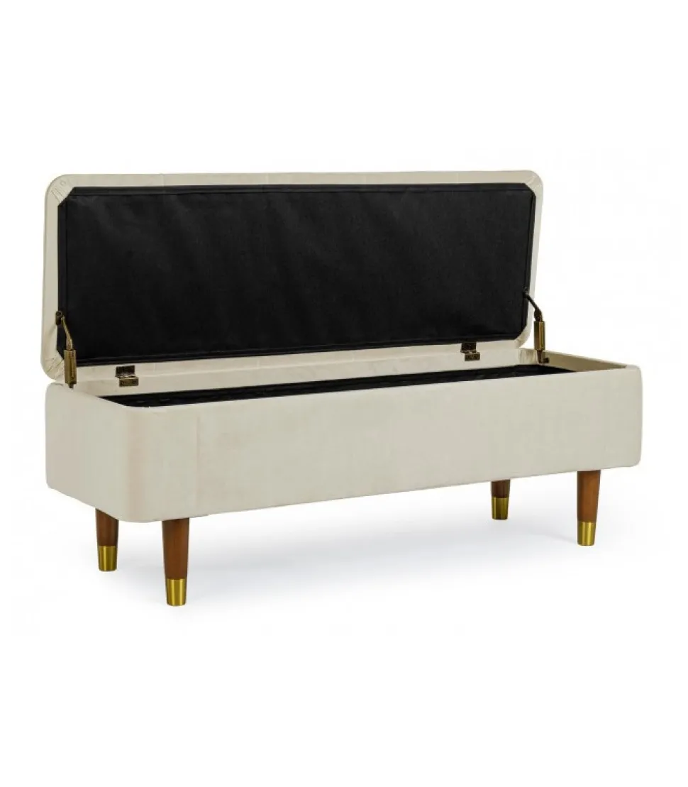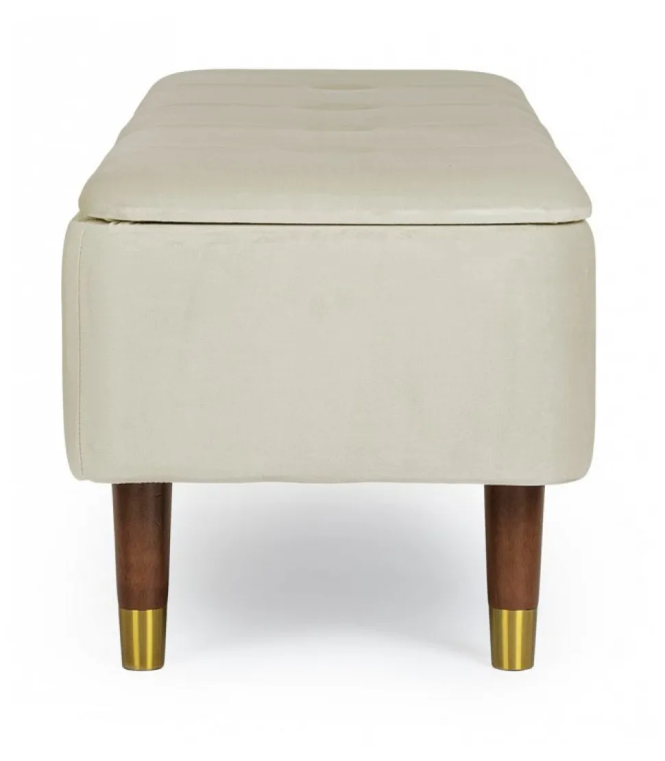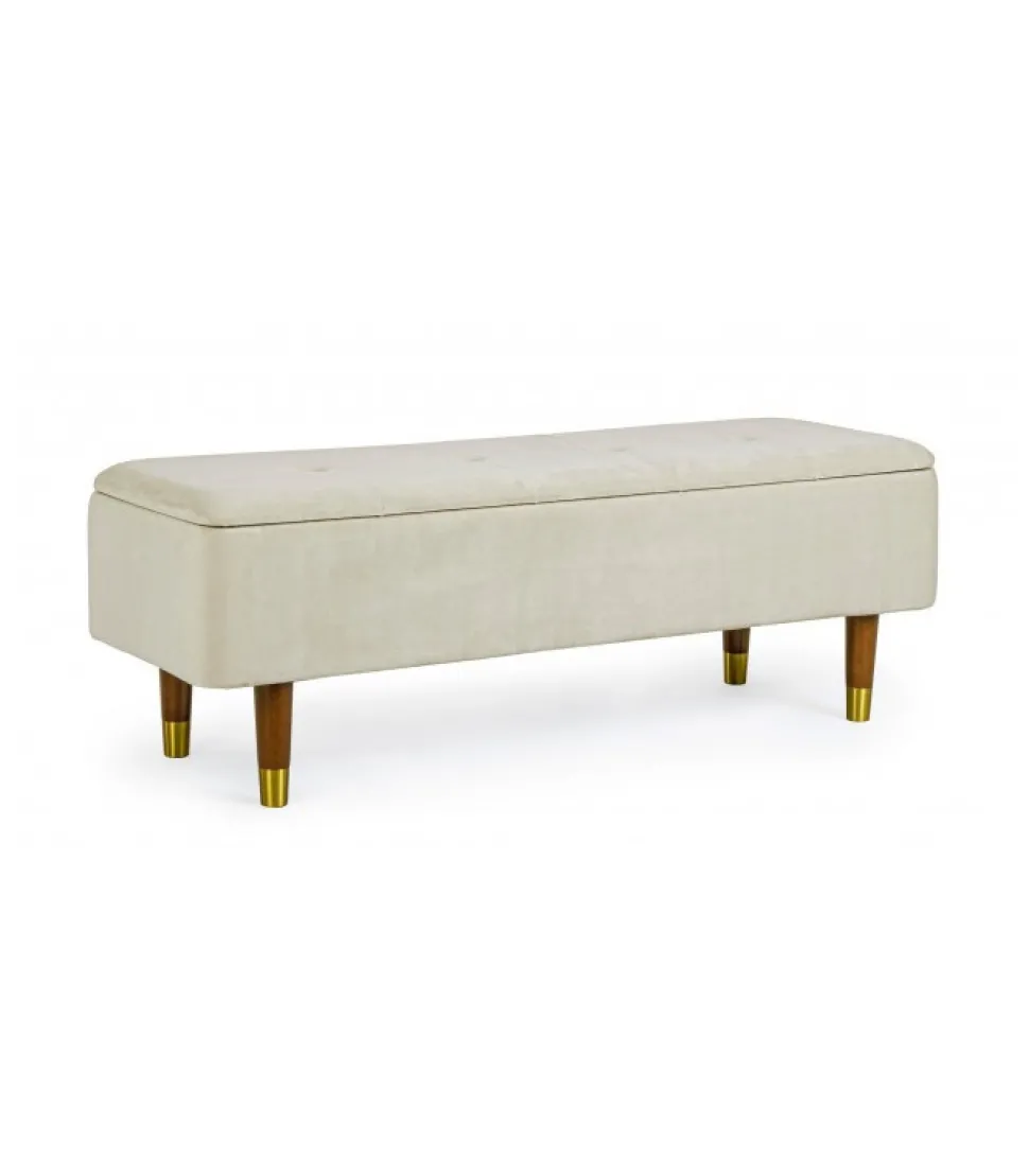 Panca 2P Contenitore Kira Nat Struttura In Mdf E Compensato. Gambe In Rubber Wood E Finali In Acciaio Vernicato Color Oro. Rivestimento In Poliestere Effetto Velluto. Gambe Da Assemblare. – Dimensioni In Cm. 120 (L.) 42 (P.) 42 H