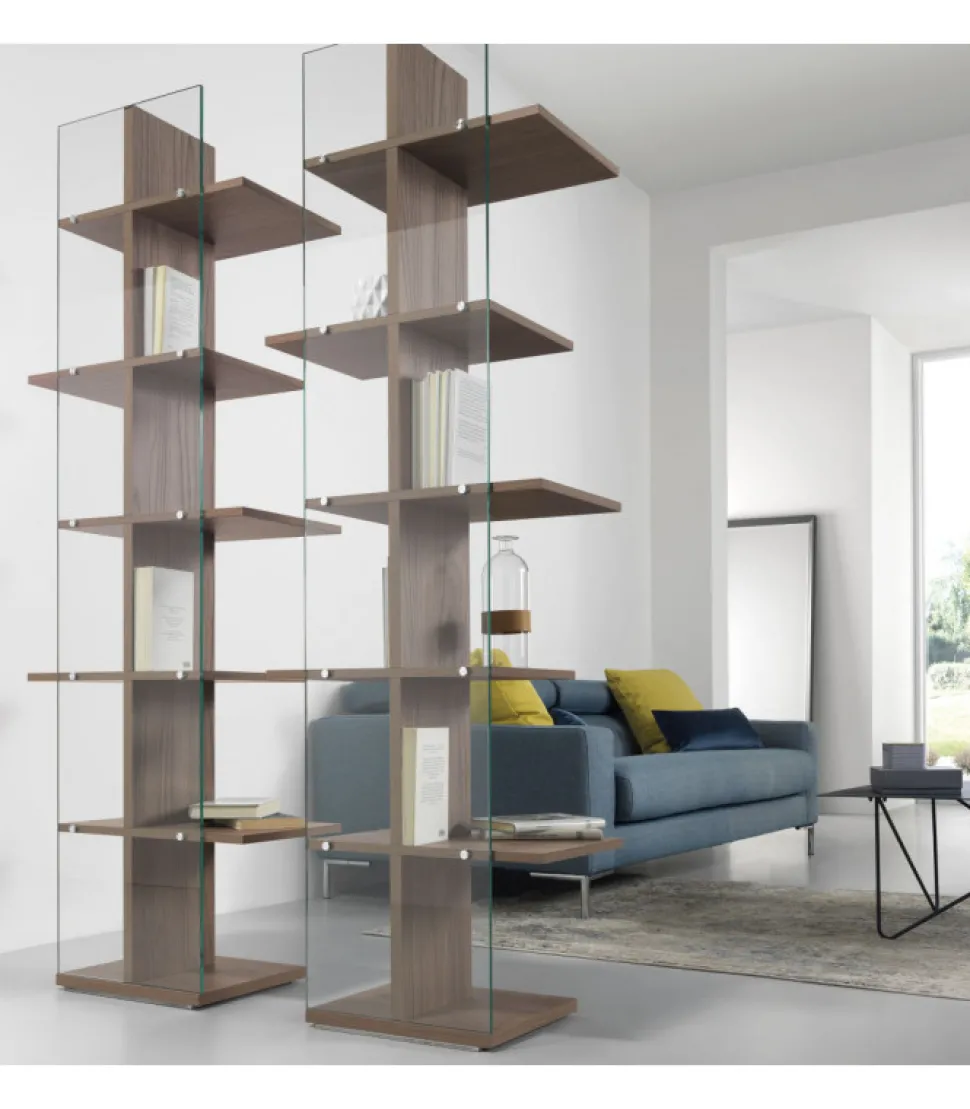 Libreria Di Grande Effetto Decorativo Con Struttura In Laminato Ecologico Spessore Mm 18-25, Schienale In Vetro Trasparente Temperato Mm 10 Ed Elementi Di Fissaggio Con Finitura Alluminio.