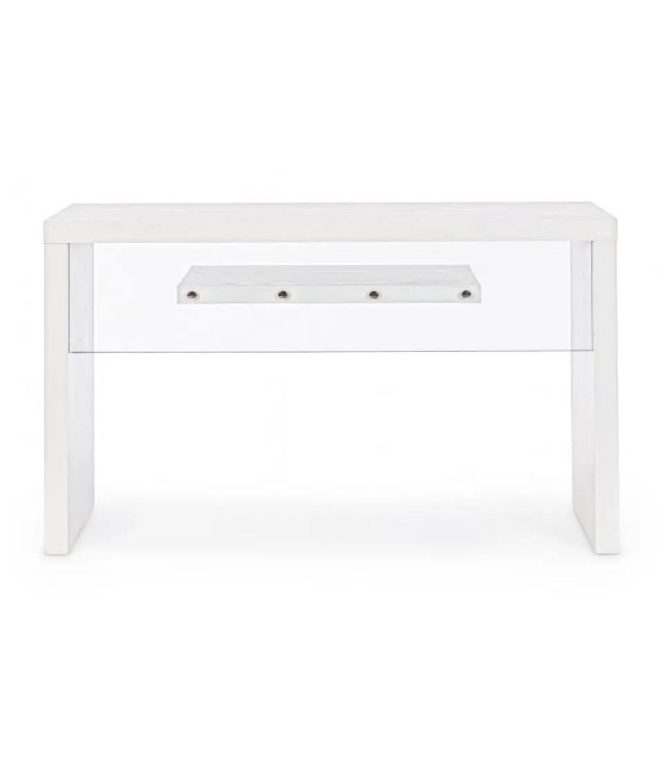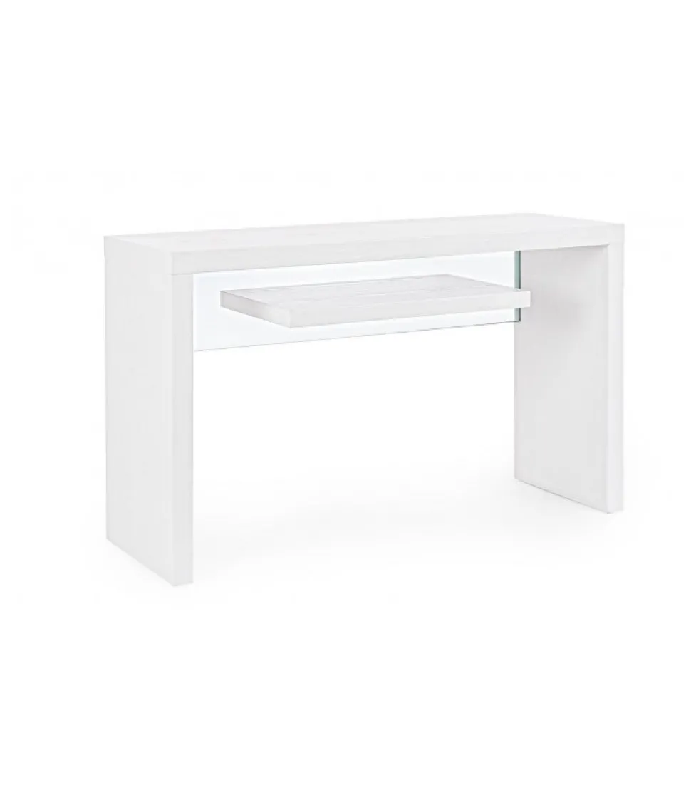Consolle 2P Line Wood Bianco 120X40 Mdf Rivestito Con Carta Melaminica Effetto Legno.Schienalino In Vetro Temperato Spessore 8Mm.Portata Max Mensola 2Kg. Da Assemblare. – Dimensioni In Cm. 120 (L.) 40 (P.) 73 H