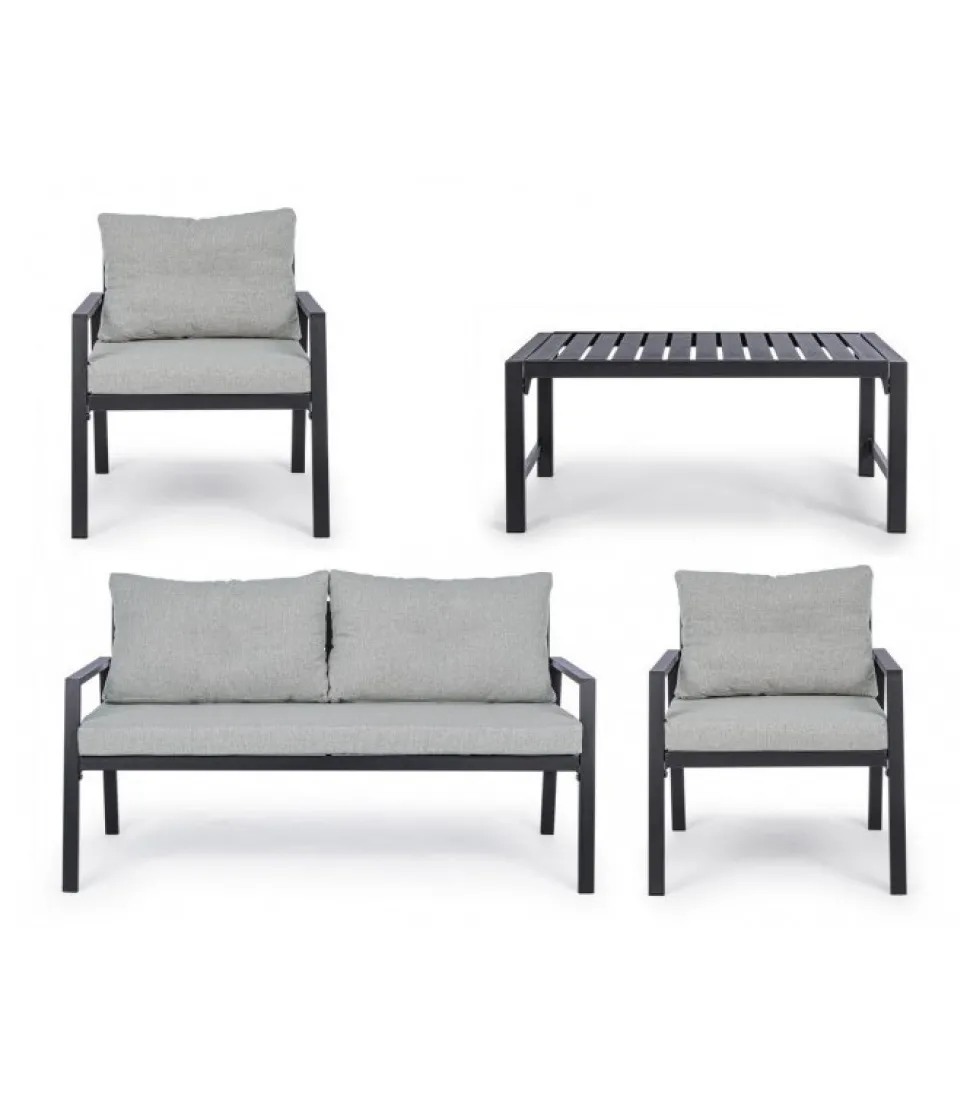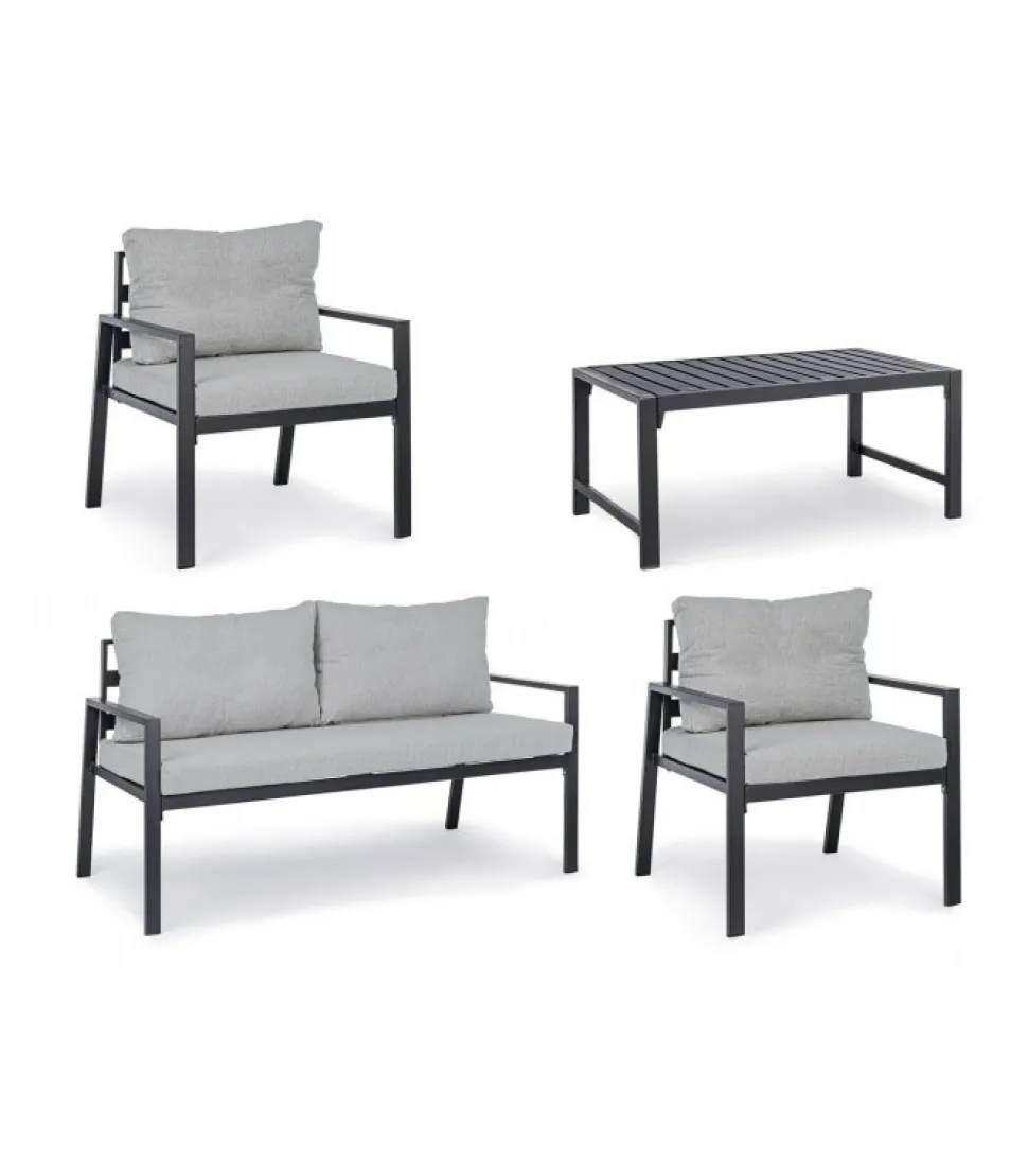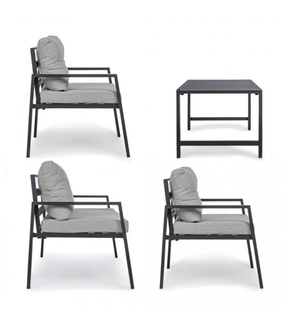 Set4 Salotto C-C Lorillard New Antracite Alluminio Verniciato A Polvere (Poliestere). Cuscini Sfoderabili Con Tessuto Spun Poly (Poliestere). Da Assemblare. – Dimensioni In Cm. A 65 (L.) 70 (P.) 82 H – 44 ( H1) 56 ( H2) 72 H3 / B 141 (L.) 70 (P.) 82 H – 44 ( H1) 56 ( H2) 72 H3 / C 90 (L.) 50 (P.) 46 H