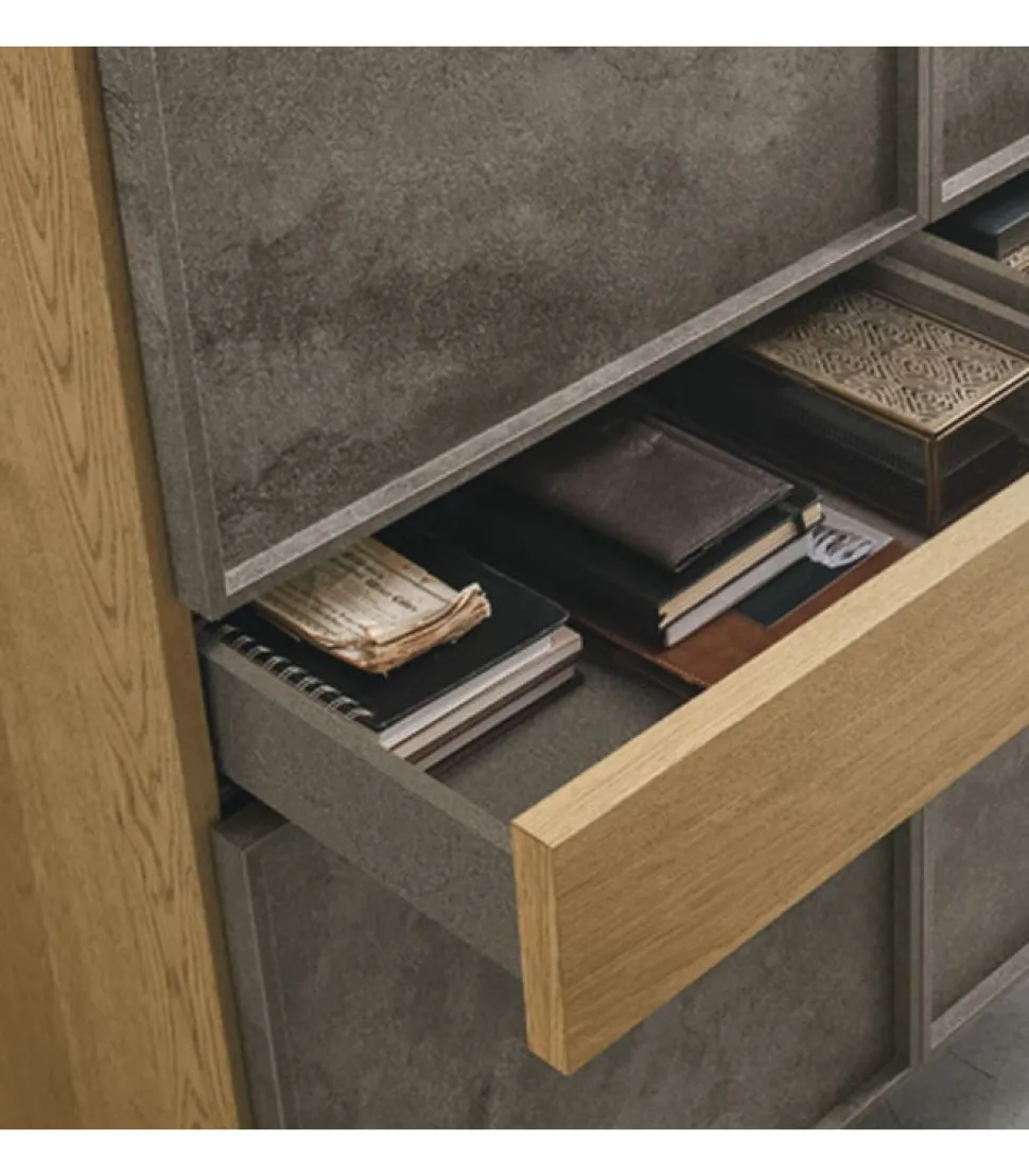 Madia Astra Con Corpo E Cassetti Impiallacciati In Legno E Ante In Laminato Effetto Pietra. Piedini In Metallo Verniciato. Astra E Dotata Di Quattro Ante E Due Cassetti. La Struttura Ed I Cassetti Sono Disponibili In Quattro Colori.