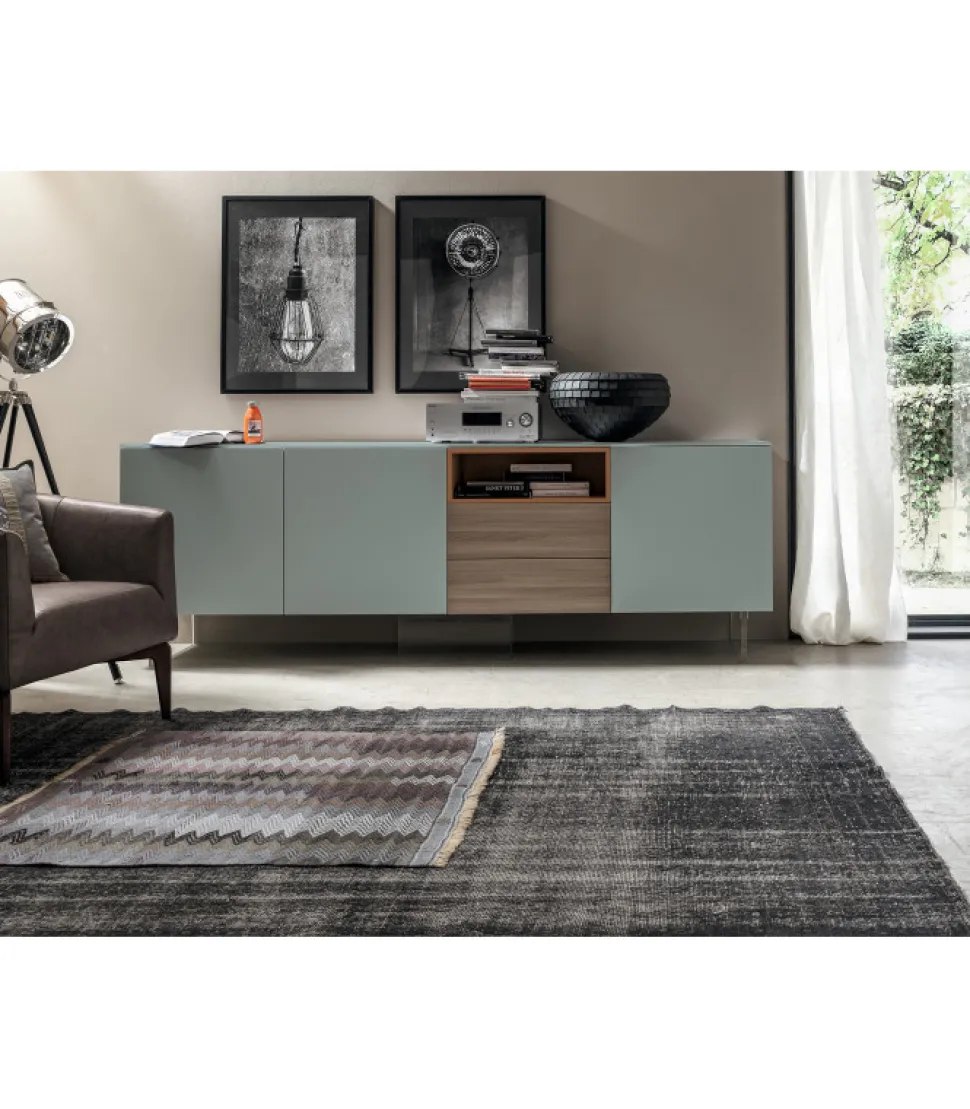 Una Madia Su Cui Linee Geometriche Semplici Trovano Esaltazione Grazie Al Mix Di Colori E Finiture Disponibili.
