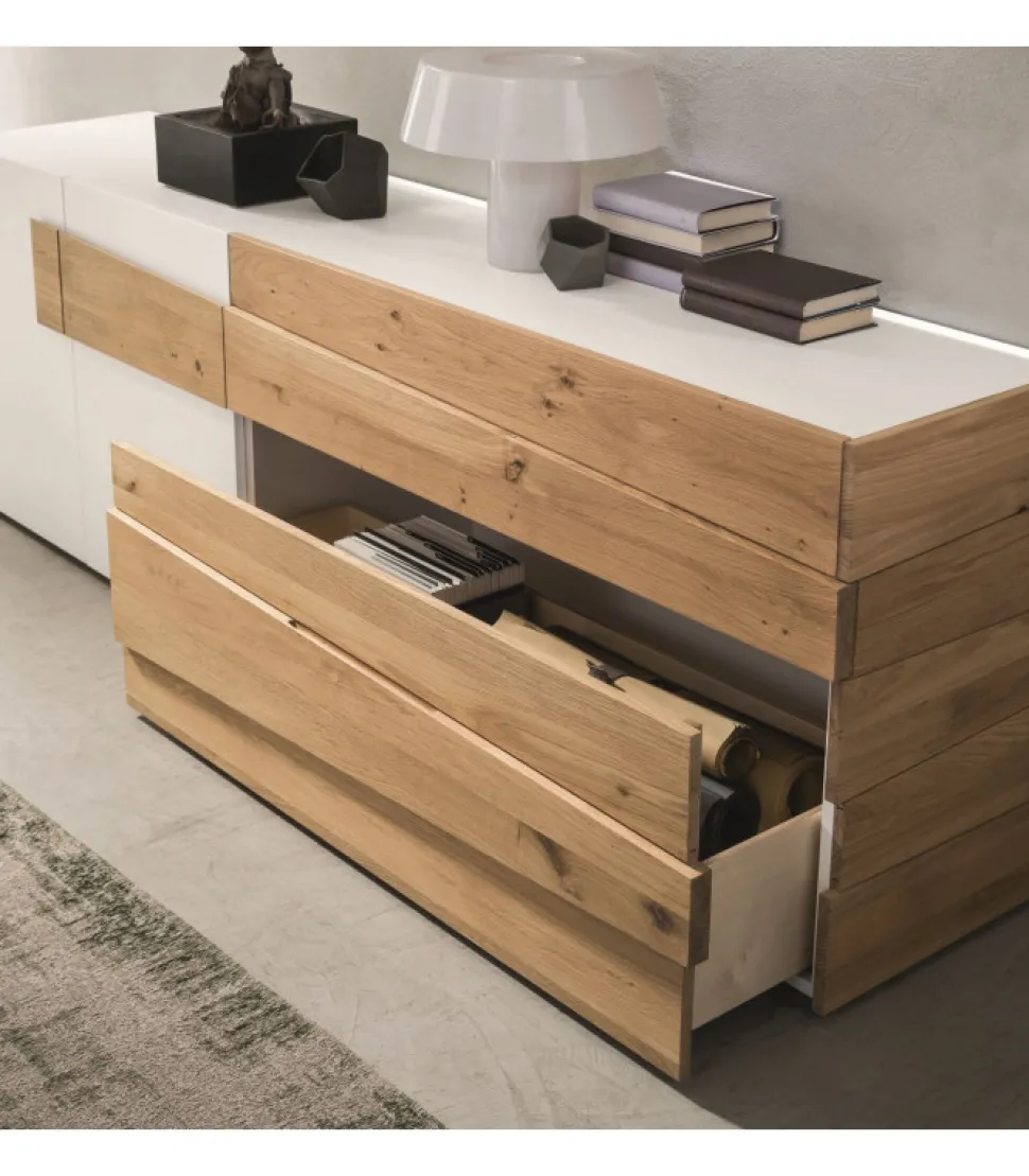 Madia Con Base A Terra, Disponibile Con 1 Anta + 2 Cassettoni, Con 2 Ante + 2 Cassettoni O Con 4 Ante. E Realizzata Per Meta In Rovere (Vero, Grigio, Moka E Savana Sono I Colori Disponibili), E Per Meta In Laccato Opaco. Struttura Interna In Finitura Melaminico Bianco. E Accessoriata Internamente Di Un Ripiano In Legno Spesso 18 Mm. Madia Montata (Smontabile). Si Consiglia L’Ancoraggio A Muro.