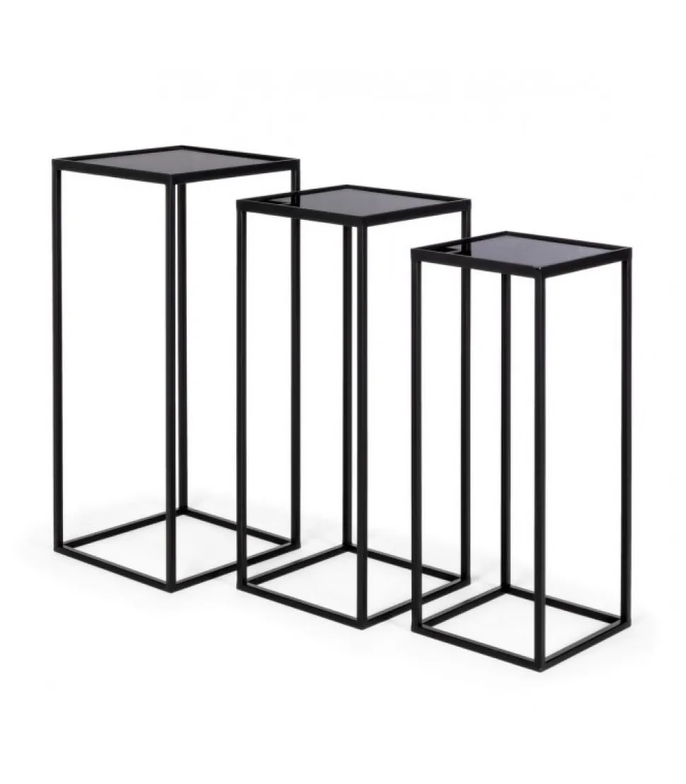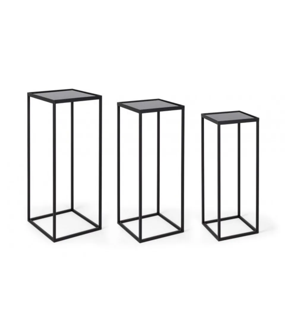 Set3 Tavolino Nucleos Qu Nero Acciaio Verniciato A Polvere Epossidica. Piano Con Vetro Colorato. – Dimensioni In Cm. 24 (L.) 24 (P.) 65 H; 28 (L.) 28 (P.) 70 H; 31 (L.) 31 (P.) 75 H