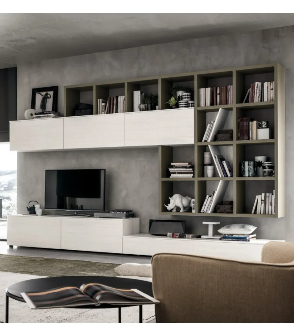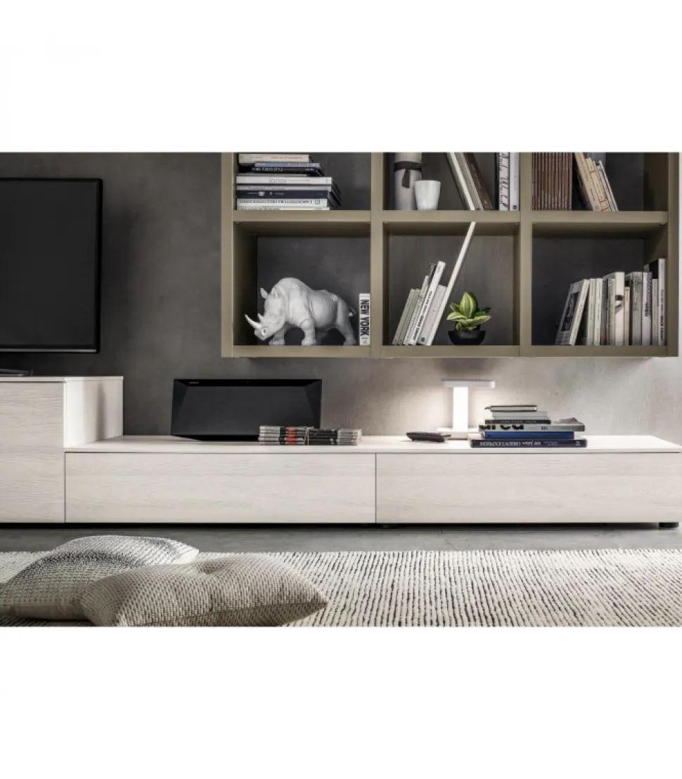 Base A Terra Con Piu Cassetti, Moduli Chiusi Orizzontali Sulla Parte Alta E Vani A Giorno Con Divisori: Una Libreria Funzionale Con Tanti Dettagli.