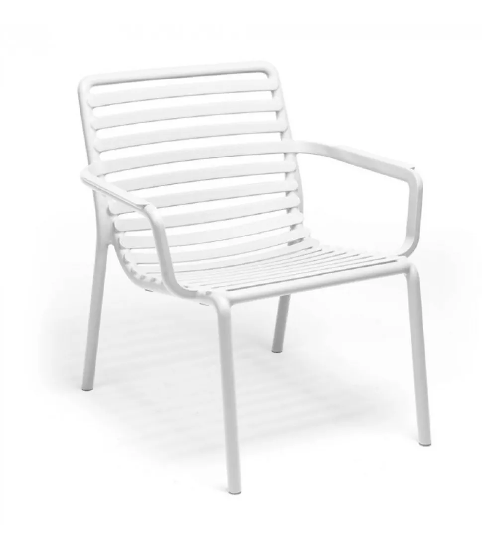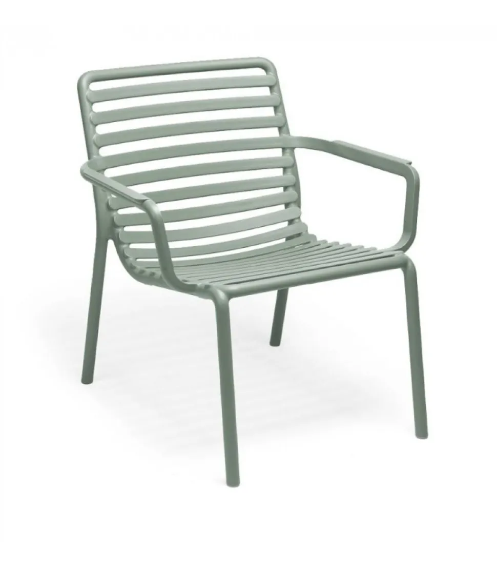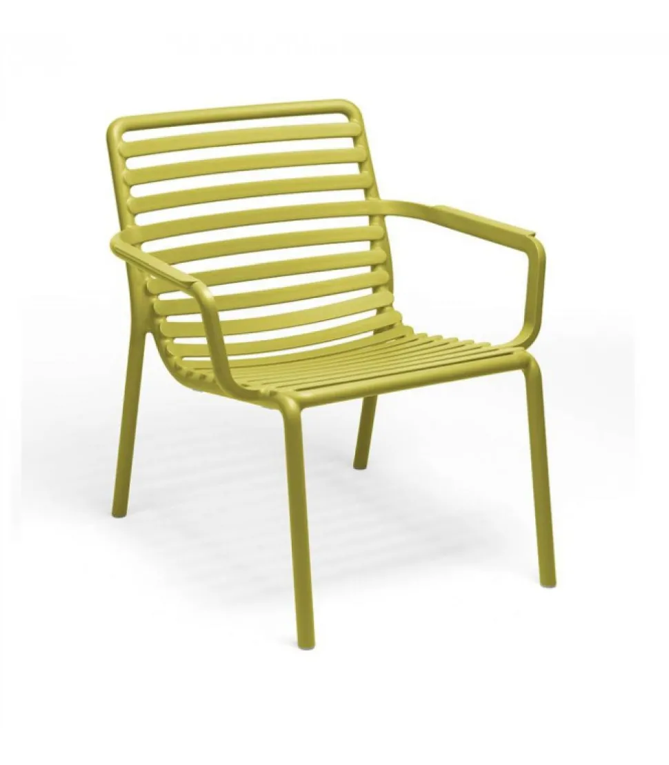 Rilassante Ampia Poltroncina Ribassata Per L’Esterno In Resina Fiberglass Contraddistinta Da Un Gioco Di Pieni E Di Vuoti Scanditi Da Una Sequenza Di Doghe Orizzontali. Impilabile, Facilmente Igienizzabile E Riciclabile.