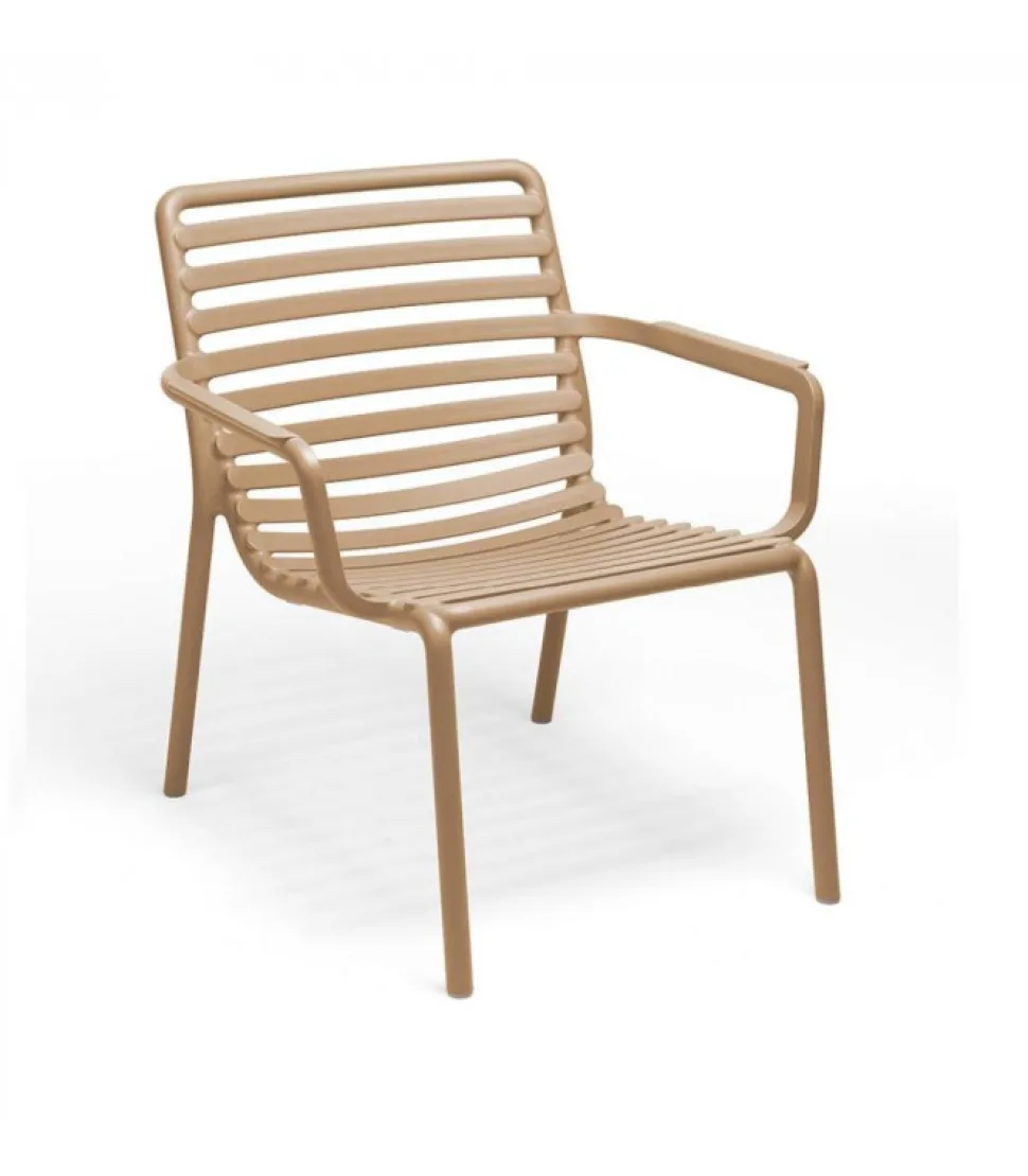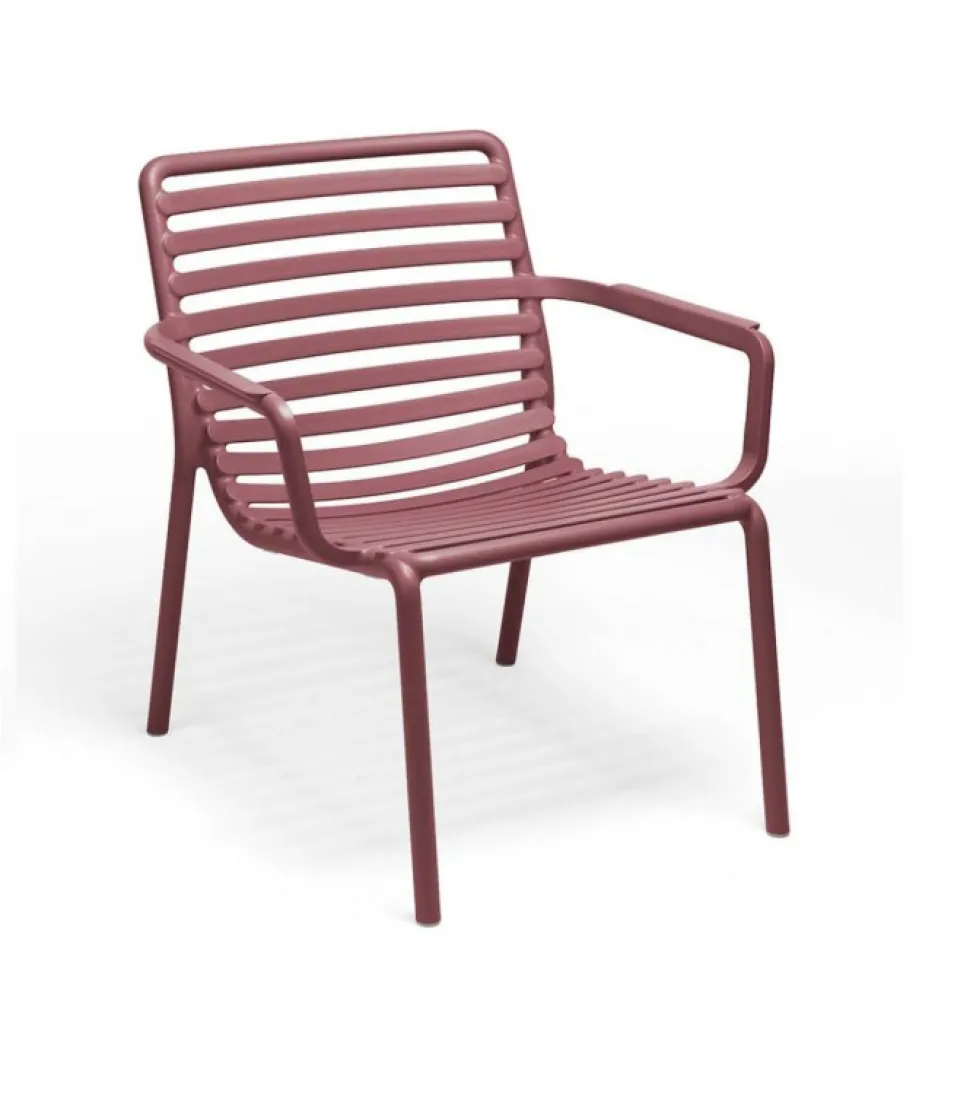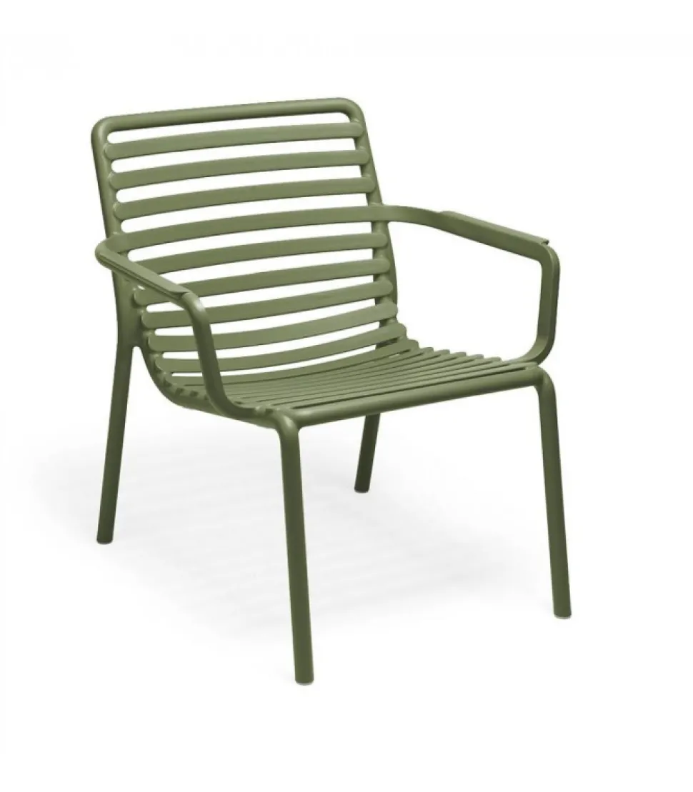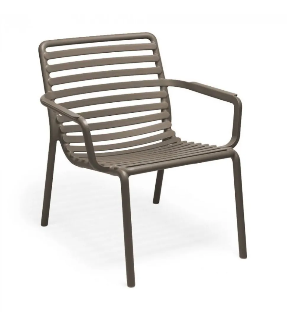 Rilassante Ampia Poltroncina Ribassata Per L’Esterno In Resina Fiberglass Contraddistinta Da Un Gioco Di Pieni E Di Vuoti Scanditi Da Una Sequenza Di Doghe Orizzontali. Impilabile, Facilmente Igienizzabile E Riciclabile.