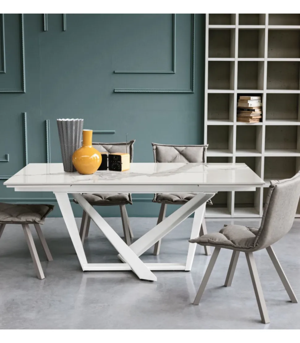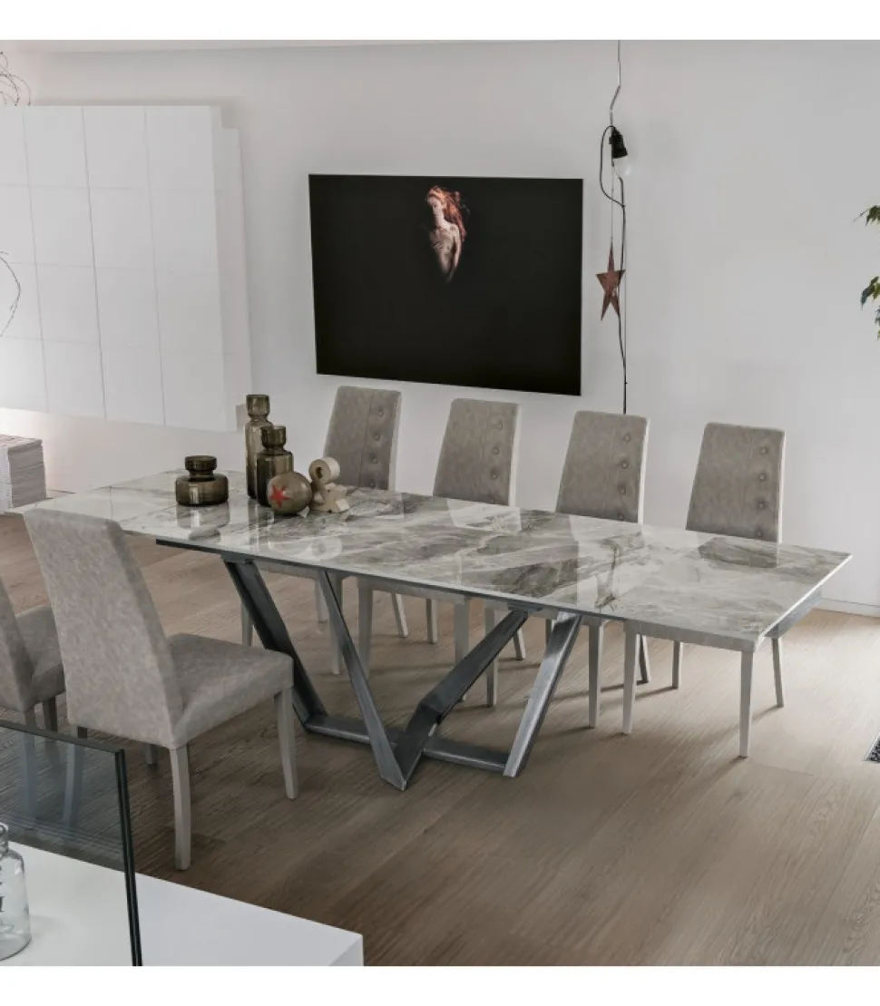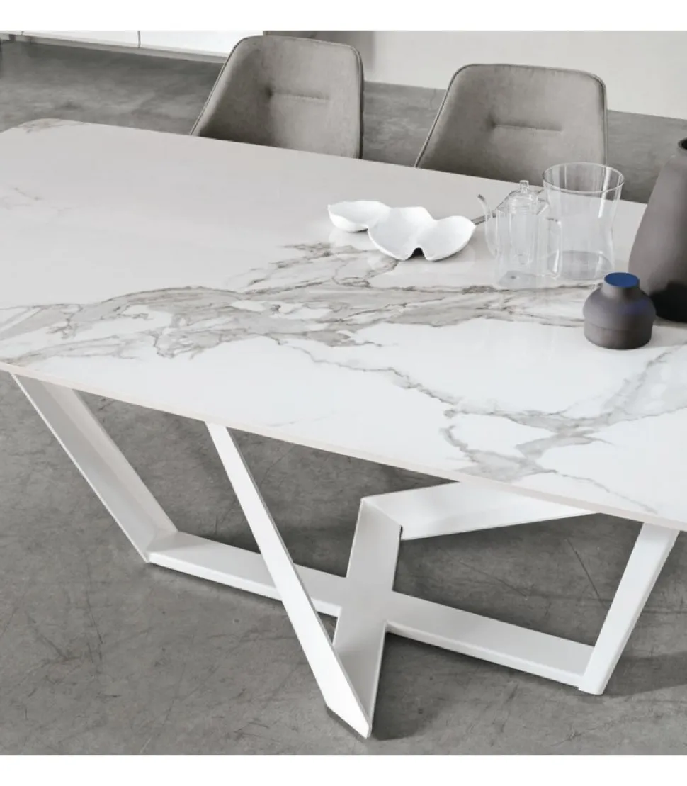 Priamo, E Un Tavolo Con Piano Ed Allunghe Laterali In Gres Porcellanato. La Struttura E Di Metallo Verniciato O Spazzolato. Priamo Grazie Alla Particolare Forma Delle Gambe Ed Ai Colori Innovativi Del Piano E Un Tavolo Rivoluzionario. E Adatto Alla Living Zone Ed Alla Sala Da Pranzo.