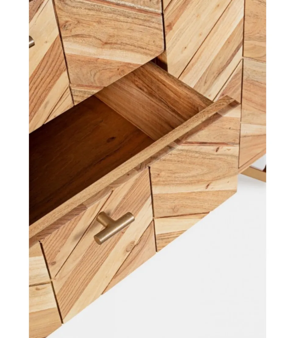 Credenza 2A-3C Raida Struttura In Legno Di Acacia, Schienali Ed Interno Cassetti In Compensato, Finitura A Base Di Vernice Poliuretanica. Gambe In Acciaio Verniciato A Polvere Epossidica. Gambe Da Assemblare. – Dimensioni In Cm. 140 (L.) 40 (P.) 76 H