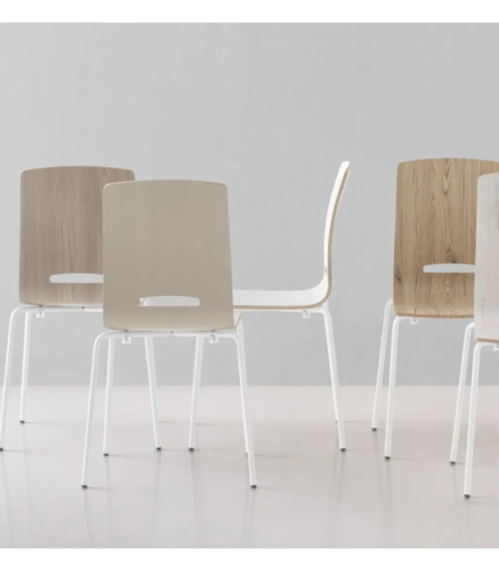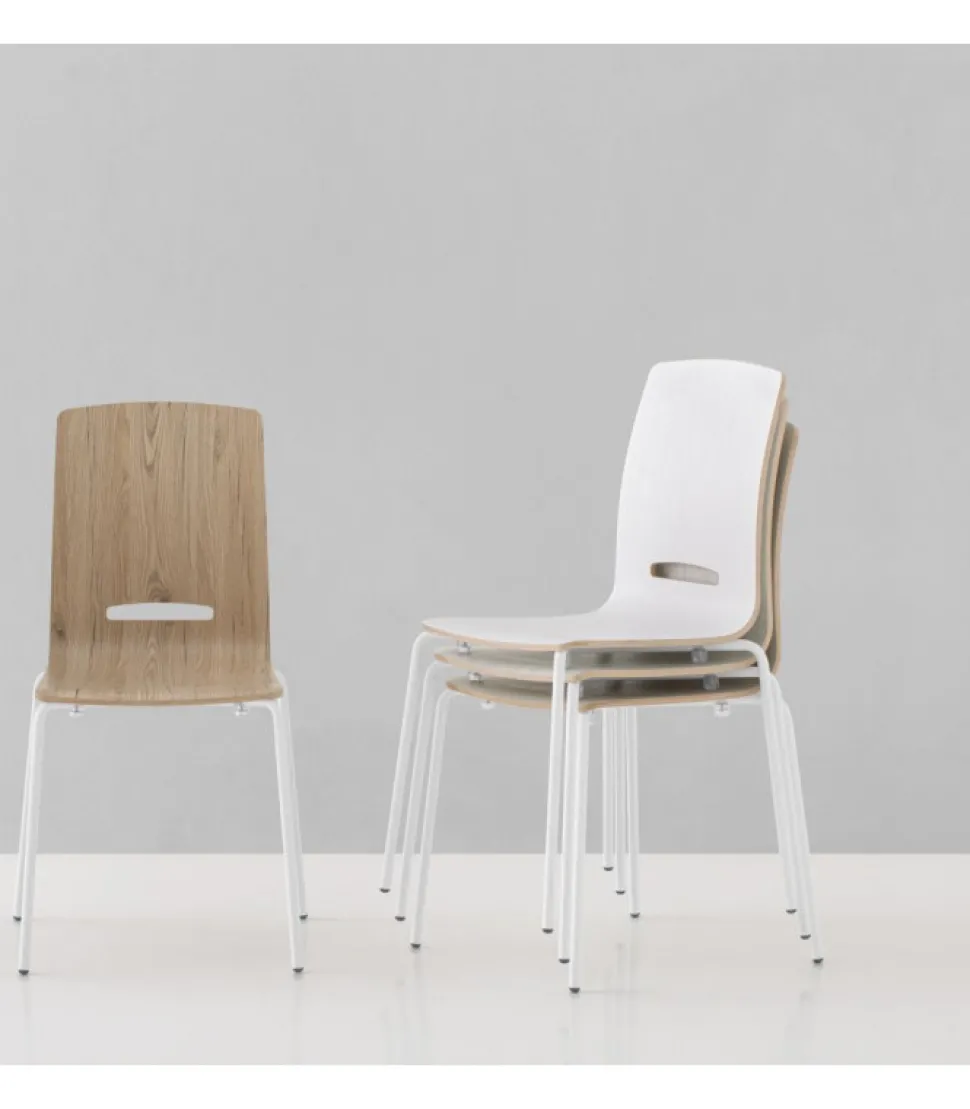 Seduta Impilabile Dalle Curve Delicate Ed Essenziali, Con Scocca In Legno Multistrato Nobilitato Melaminico Effetto Legno O Monocolore, Da Abbinare Ai Piani O Alle Gambe Dei Tavoli.