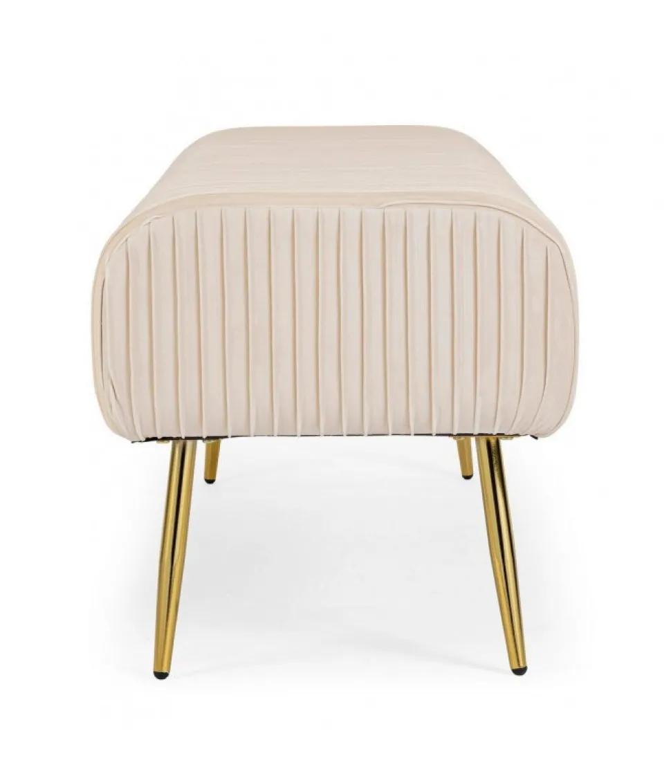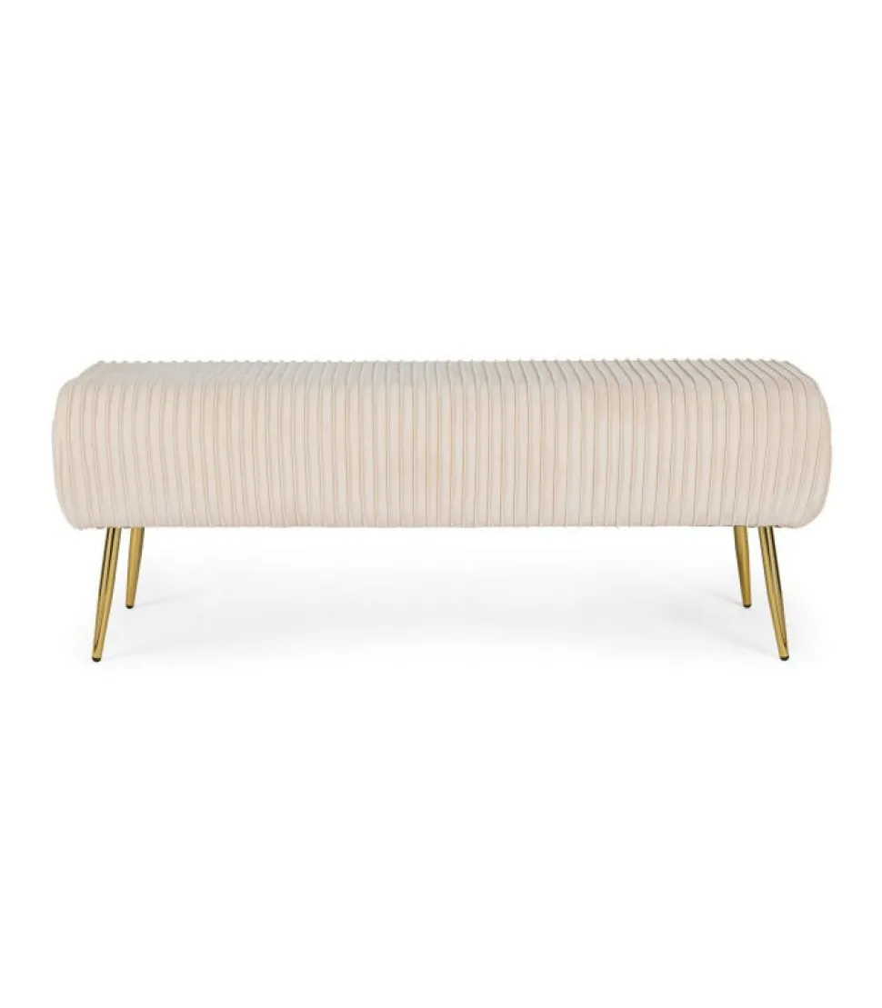 Panca 2P Selena Crema Struttura In Mdf E Compensato. Gambe In Acciaio Cromato Color Oro. Rivestimento In Poliestere Effetto Velluto A Coste. Densita’ Imbottitura 30Kg/M3. Gambe Da Assemblare. – Dimensioni In Cm. 129 (L.) 45.5 (P.) 48 H