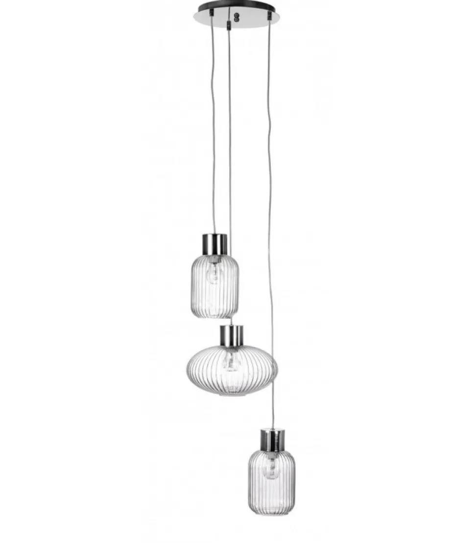 Lampadario 3Luci Showy To Trasp-Arg Acciaio Finitura Cromata. Paralumi In Vetro. Lamp. (3X) E27 Max 60W, E27 11W Comp. Fluor Integr. Risp. En. , E27 42W Alog. Risp. En. Lampadina/E Non Inclusa/E. Lunghezza Cavo: 1.5 Mt. Da Assemblare – Dimensioni In Cm. O40X150 H