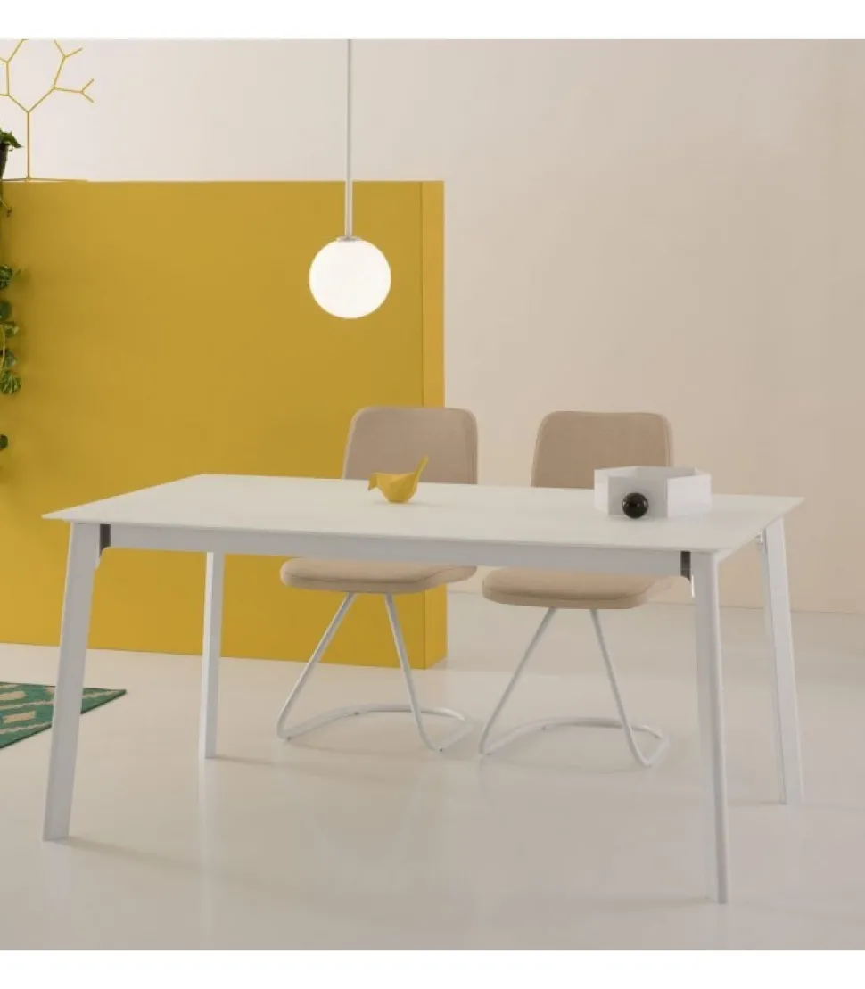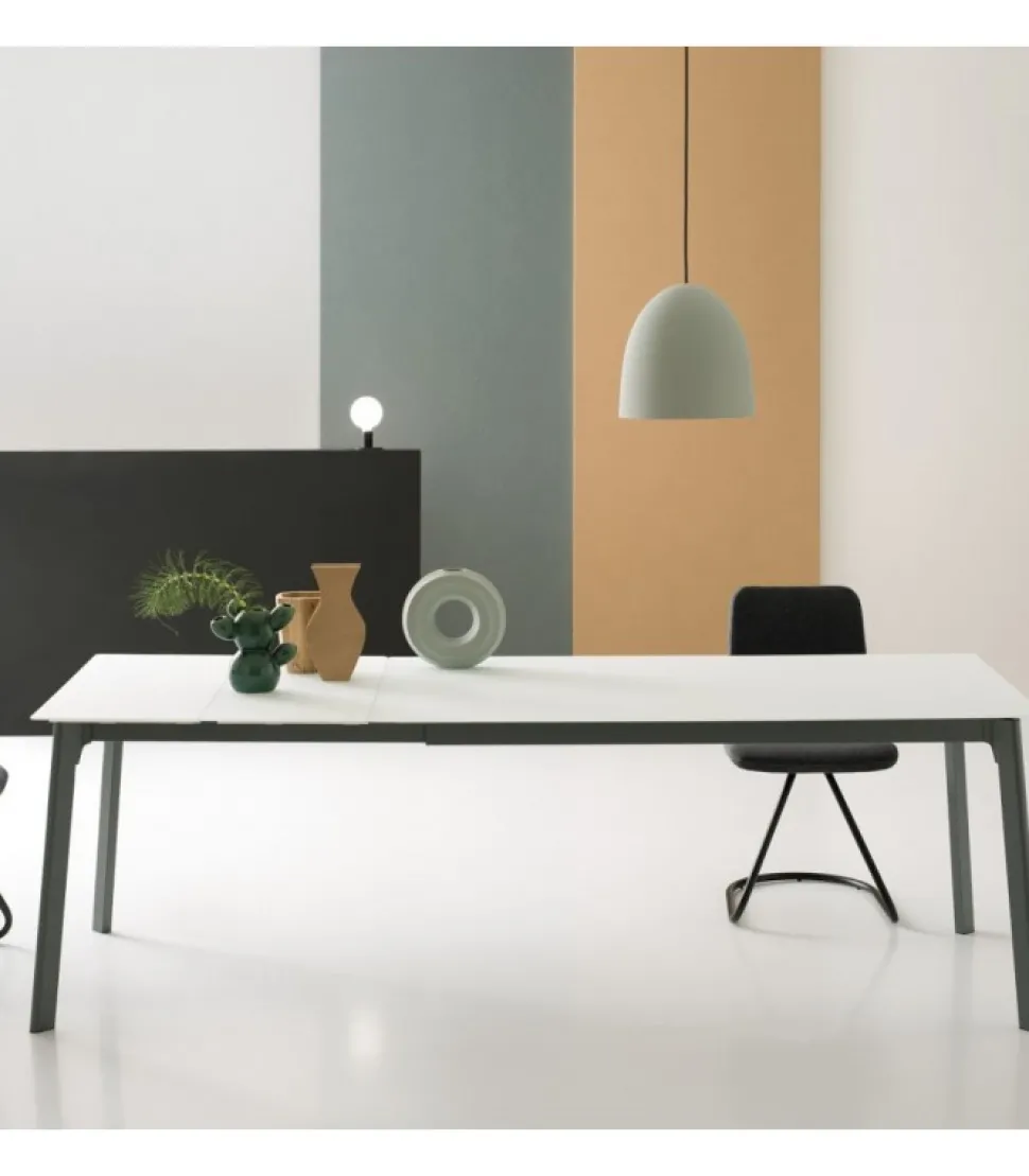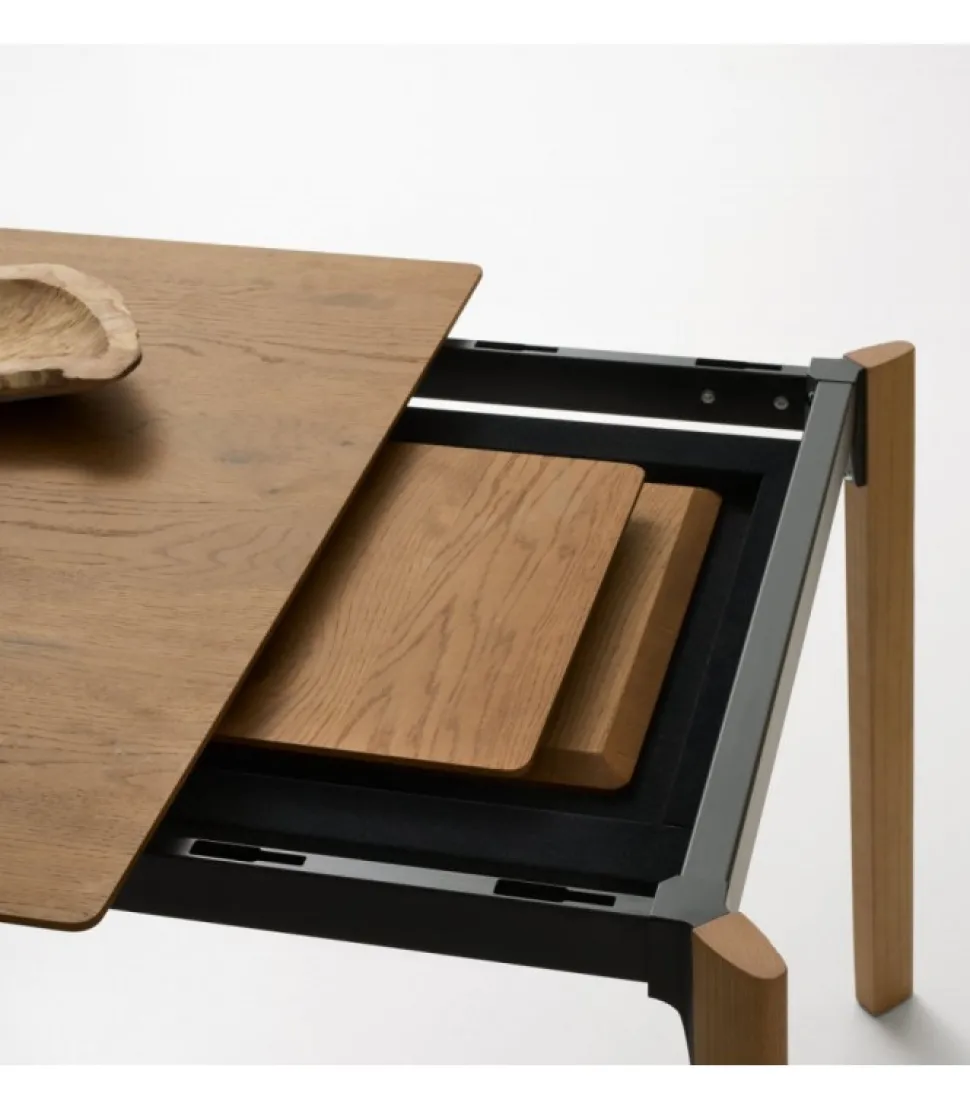 Struttura Composta Da Profili In Acciaio Tagliati A Laser, Verniciata A Polveri Epossidiche. Giunto Angolare D’Unione Stampato In Lega Di Alluminio, In Finitura Spazzolata Lucida O Verniciata. Gambe In Acciaio Verniciato Dotate Di Un Dispositivo Brevettato Di Ruote A Scomparsa “Click Clack”, Che Agevola L’Apertura Del Tavolo. Il Piano E L’Allunga Sono Impiallacciati Sp.18 Mm Con Bisellatura E Angoli Raggiati Oppure Con Sistema “Glue Point”, Che Consiste Nell’Incollaggio Di Un Piano Di 6 Mm — Vetro Temperato, Ceramica Oppure Un Pannello Cleaf O Fenix Con Angoli Raggiati — Su Un Sottopannello Da 12 Mm.