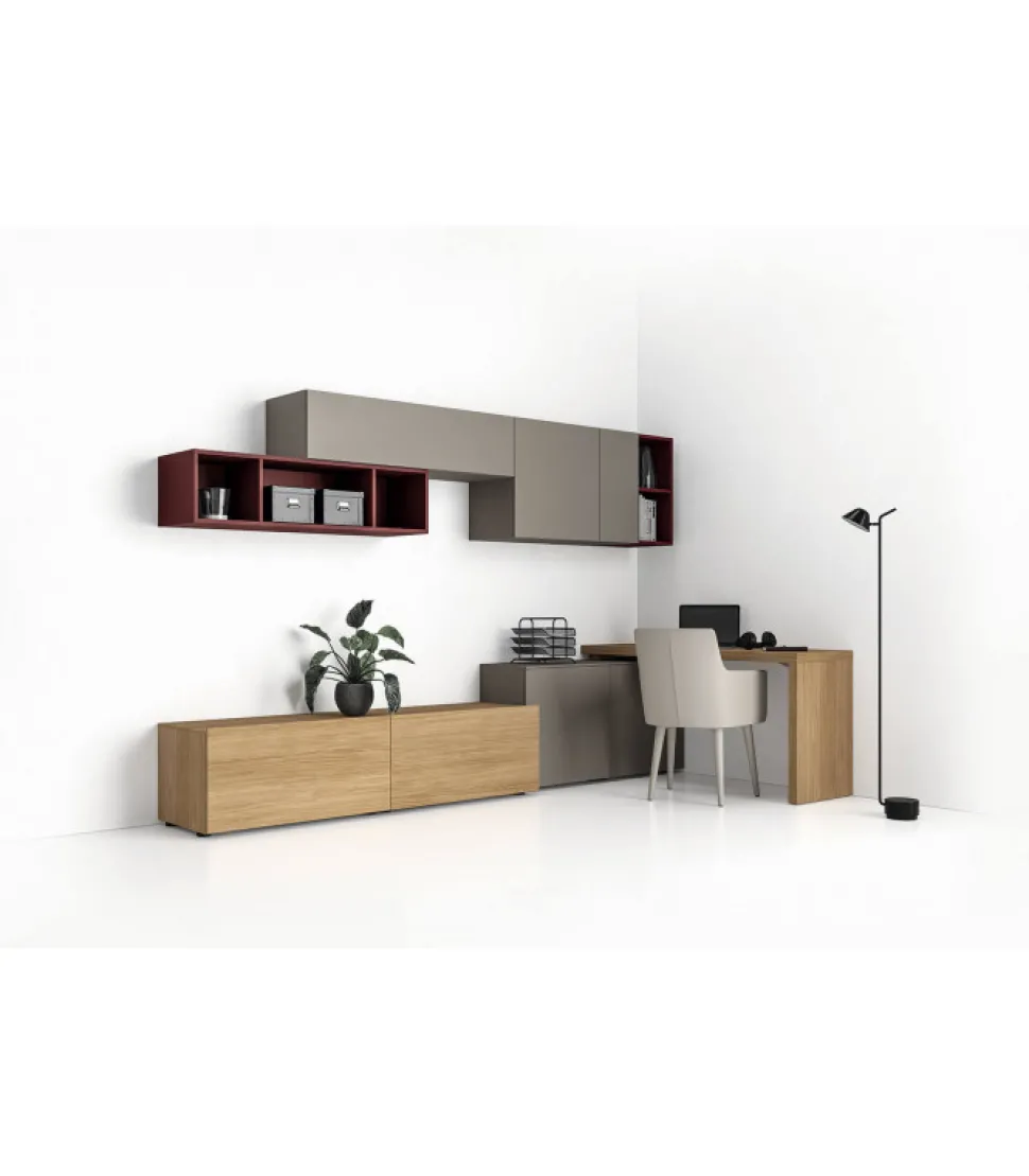 Questo Soggiorno / Home Office E Composto Da Due Capienti Cestoni Dove E Possibile Appoggiarci Sopra La Televisione. I Pensili Si Alternano Tra Elementi Chiusi Ed Elementi A Giorno Che Hanno La Stessa Funzione Di Una Libreria Oppure Per Esporre Gli Oggetti Piu Belli.
