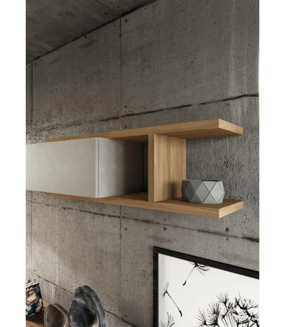 La Mensola In Essenza Abbraccia Il Pensile Orizzontale Nella Finitura Calce, Dando Vita A Un Effetto Complessivo Armonioso. Vivere Il Soggiorno Diventa Un’Esperienza Rilassante Capace Di Stimolare Riflessioni Profonde.