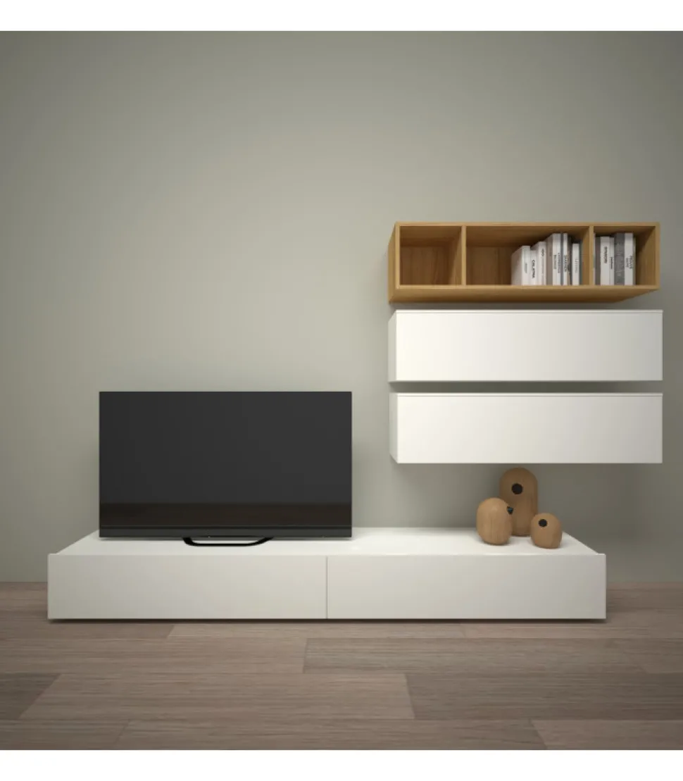 Capiente Soggiorno Lineare Composto Da Due Cestoni, Due Pensili Ribalta E Un Modulo Libreria.