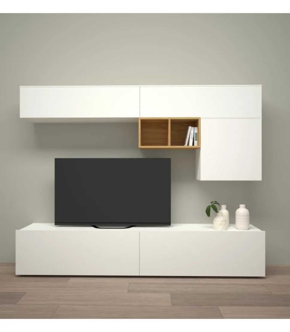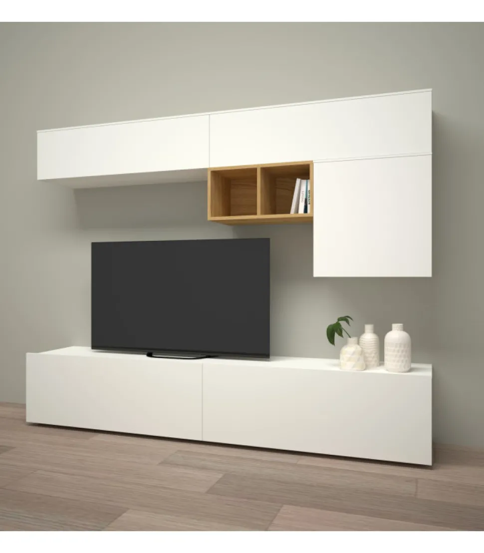 Soggiorno Bianco Dal Design Lineare , Caratterizzato Da Un Modulo Libreria In Rovere Gold, Attribuendogli Uno Stile Nordico.