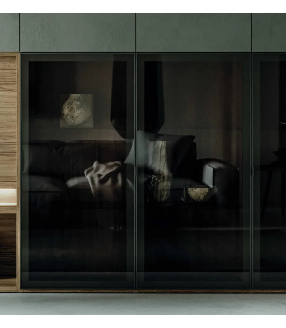 Le Spalle E Ripiani Della Libreria Sono Caratterizzati Dallo Spessore Importante Della Struttura Sp.35 Mm E Dalle Ante In Vetro Con Telaio.