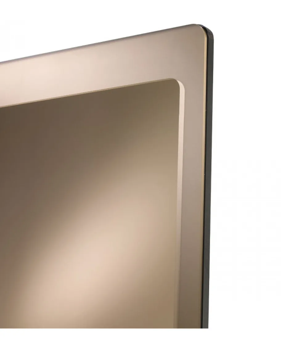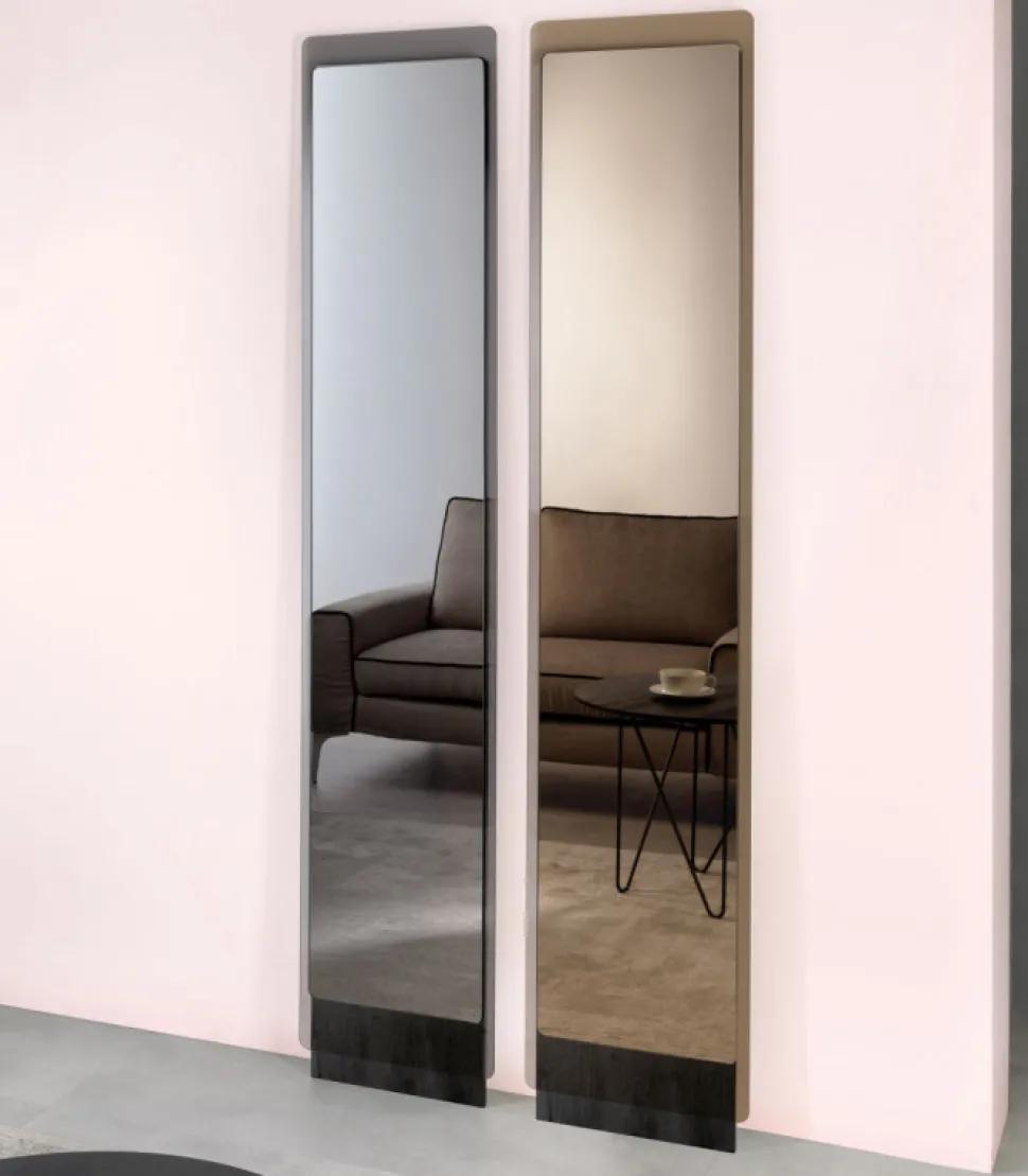 Un Vetro Trasparente Grigio Fume (O Bronzo) Fa Da Cornice Allo Specchio Grigio Fume (O Bronzo) Che Viene Incollato Al Centro Con Una Pellicola Adesiva Di Sicurezza. Lo Specchio E Fissato Ad Un Pannello Di Laminato Ecologico Da 12 Mm Che Arriva A Terra Ed Incorpora Il Sistema Di Fissaggio A Parete (Ed Alla Libreria 0/544).