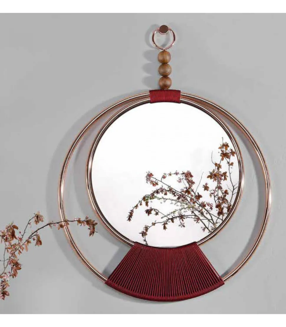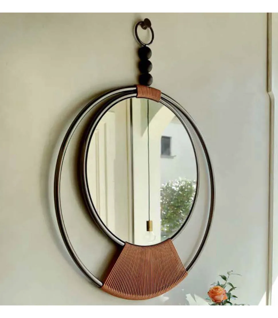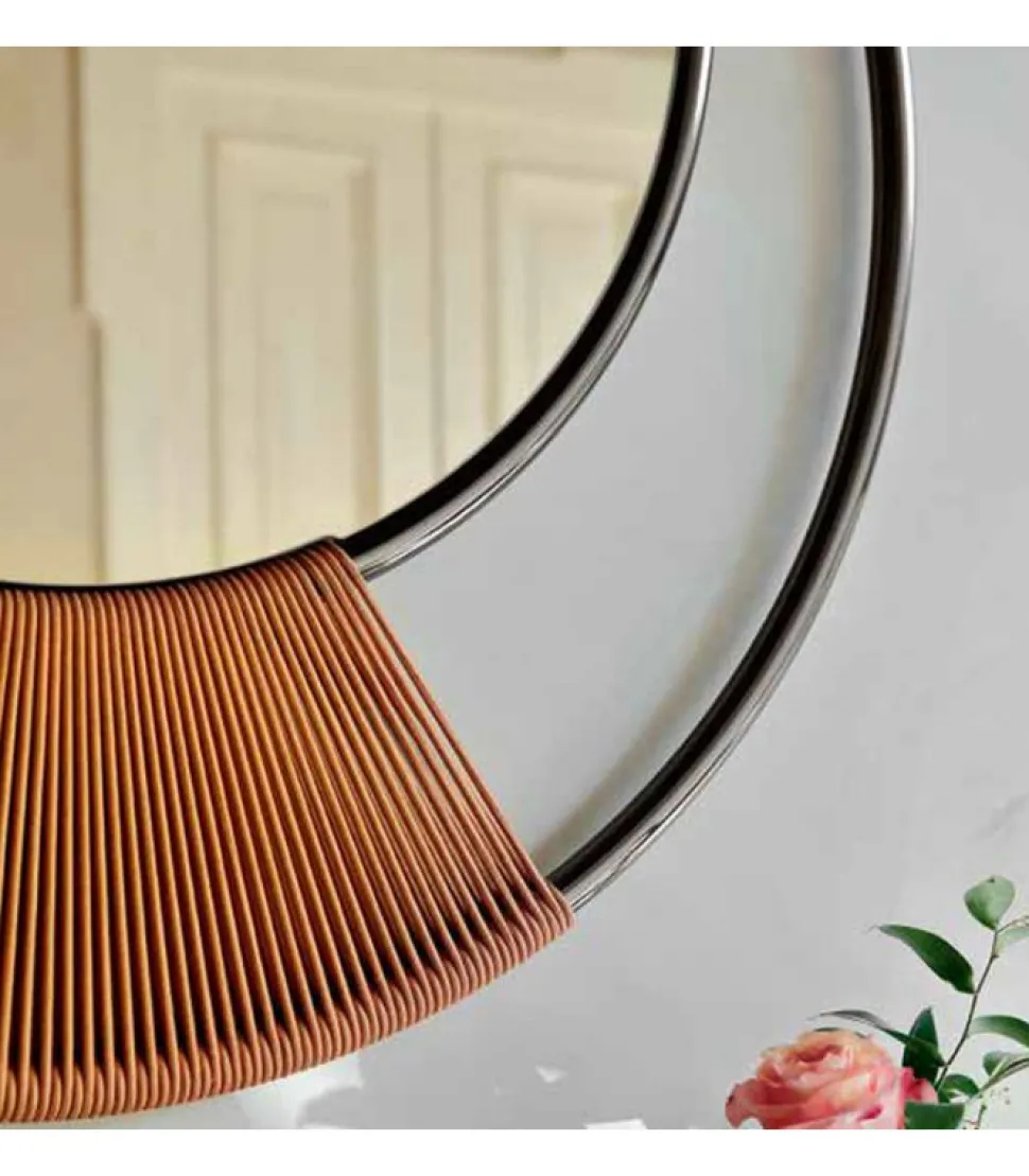 Un Delicato Intreccio In Tessuto, Sapientemente Lavorato A Mano, Sostiene Uno Specchio Dalle Finiture Bronzate O Argentee. Una Struttura In Metallo Cromato, Un Cerchio Protettivo Per Lo Specchio, Forma Una Figura Leggera E Presente, Che Si Completa Con Tre Particolari In Legno Massello. Un Pendente Per Rendere Indimenticabile Ogni Parete.