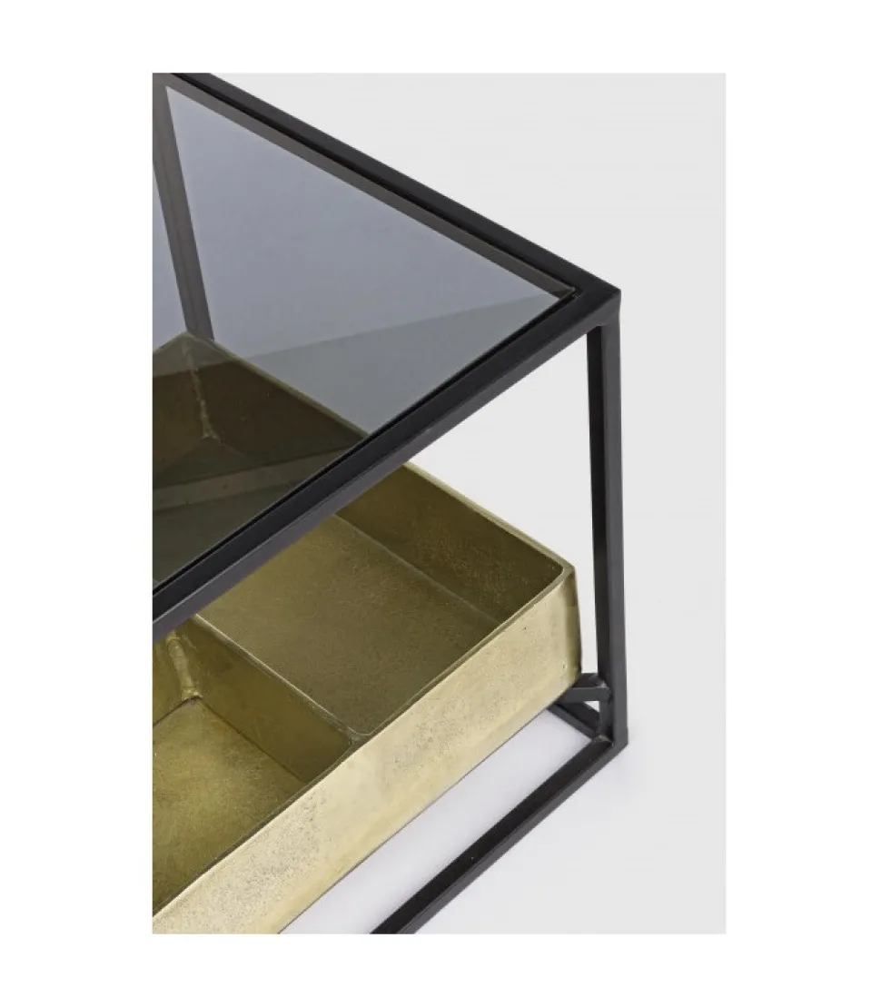 Tavolino C-Contenitore Mavila 42X42Struttura In Acciaio Verniciata A Polvere Epossidica- Piano Superiore In Vetro- Piano Inferiore Con Contenitore In Alluminio Con Finitura Placcata Ottone Ed Anticata.Dimensioni:42(L) – 42(P) – 40(H)