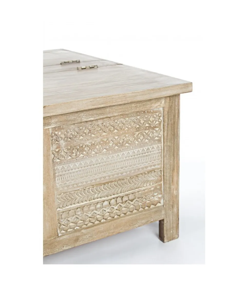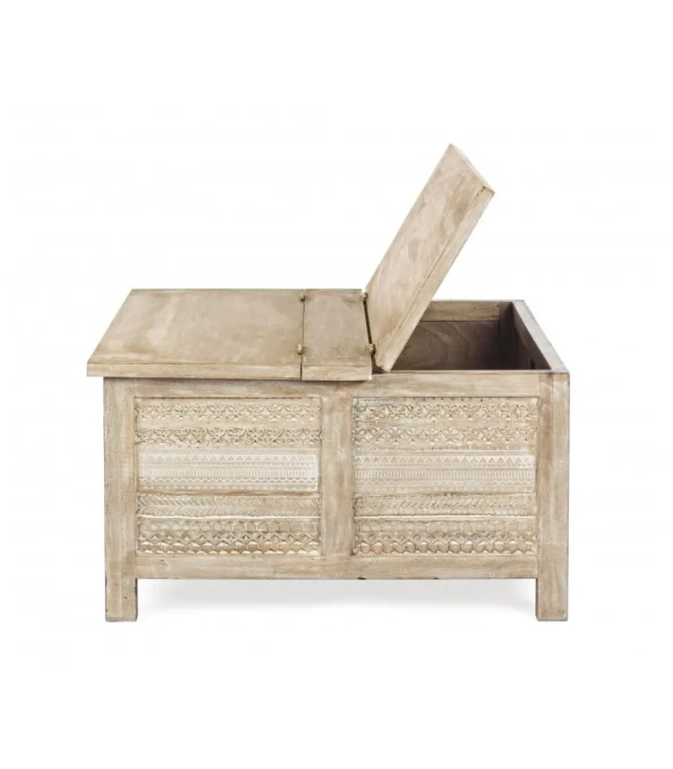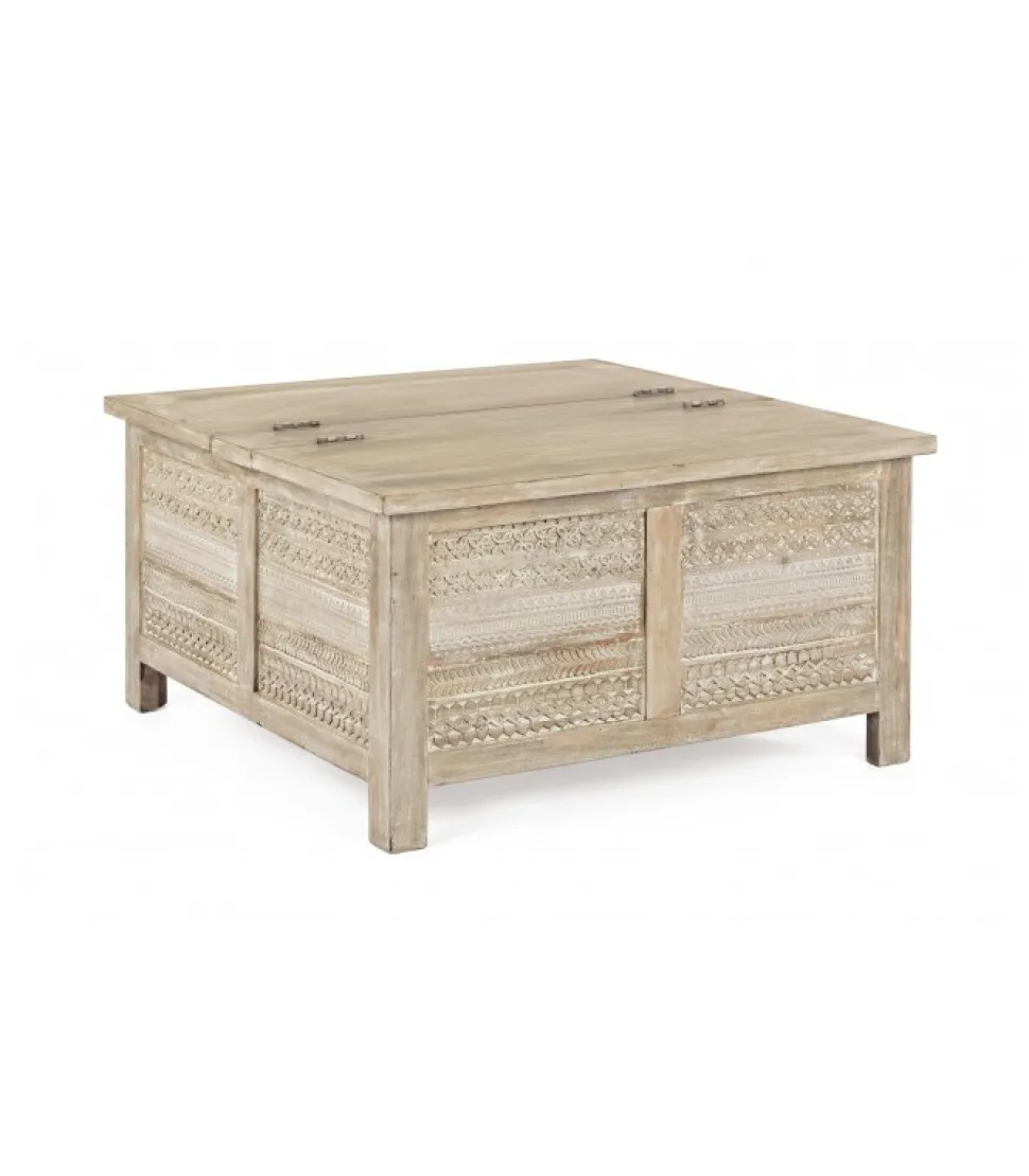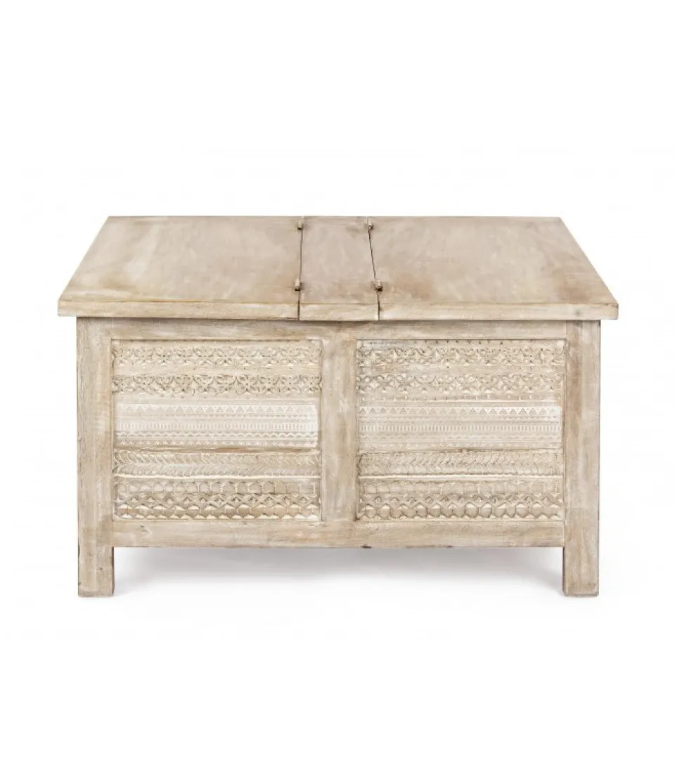 Tavolino C-Contenitore Mayralegno Di Mango Con Decorazioni Intarsiate A Mano E Piano Apribile- Finitura A Base Di Nitrocellulosa.Dimensioni:80(L) – 80(P) – 45(H)