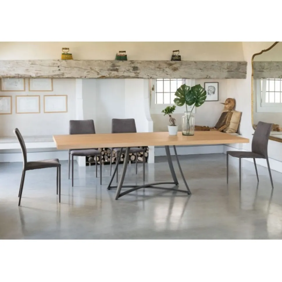 Tavolo Big Bang, E Un Originale Tavolo Dal Gusto Moderno E Di Grande Personalita. Il Basemento In Acciaio Verniciato A Crociera E Curvato Da A Big Bang Un Forma Nuova E Gradevole. Disponibile Con Piani In Legno, Cristallo, Cristallo Velvet, E Super Ceramica.