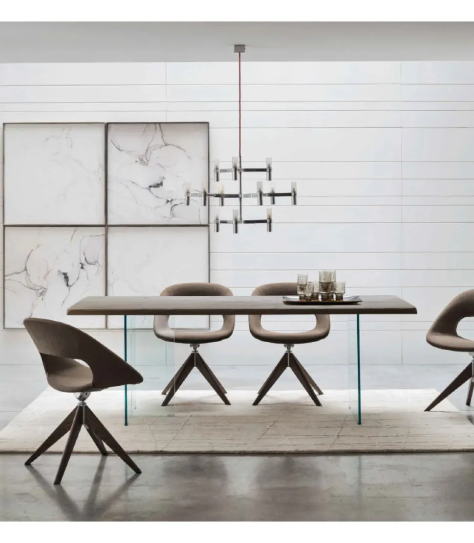 La Caratteristica Principale Di Questo Tavolo E Il Basamento Asimmetrico In Vetro Che Fa Contrasto Con Uno Spesso Piano In Legno.