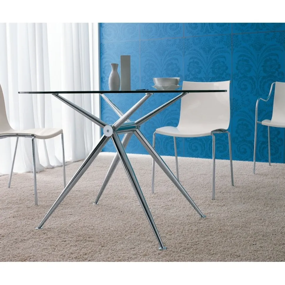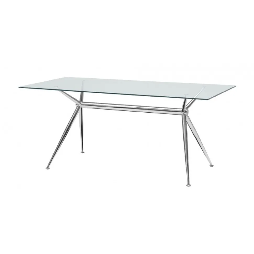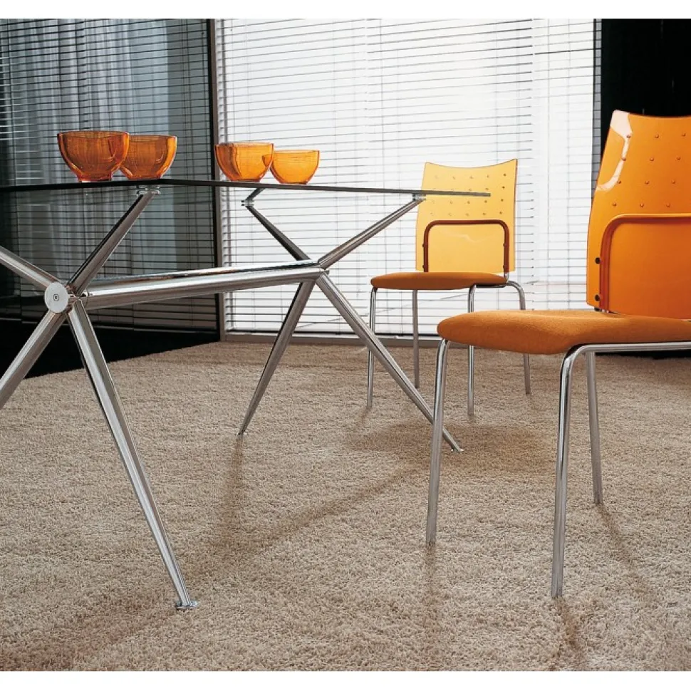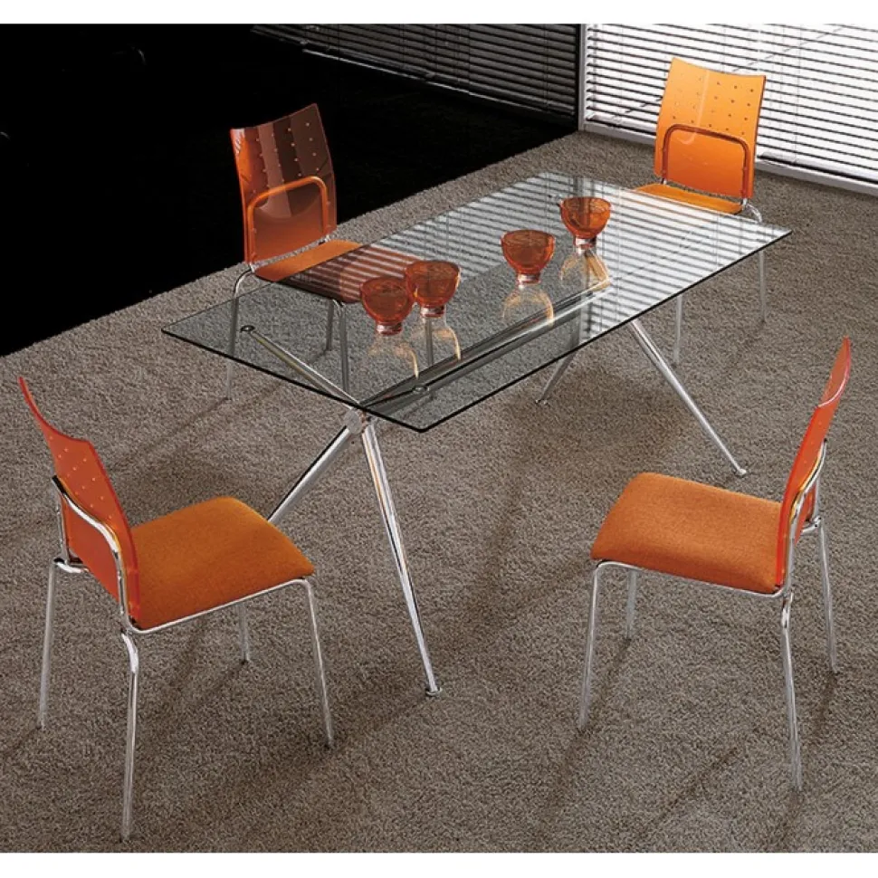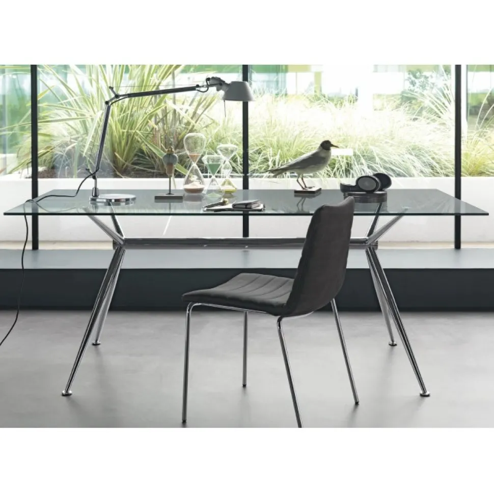 Brioso Un Tavolo Fisso Con Piano In Vetro Di Sicurezza Temperato Disponibile In Tre Misure E In Versione Con Traverso Centale Rivestito In Cuoio Per Abbinamenti Con Le Sedie Del Nostro Catalogo.