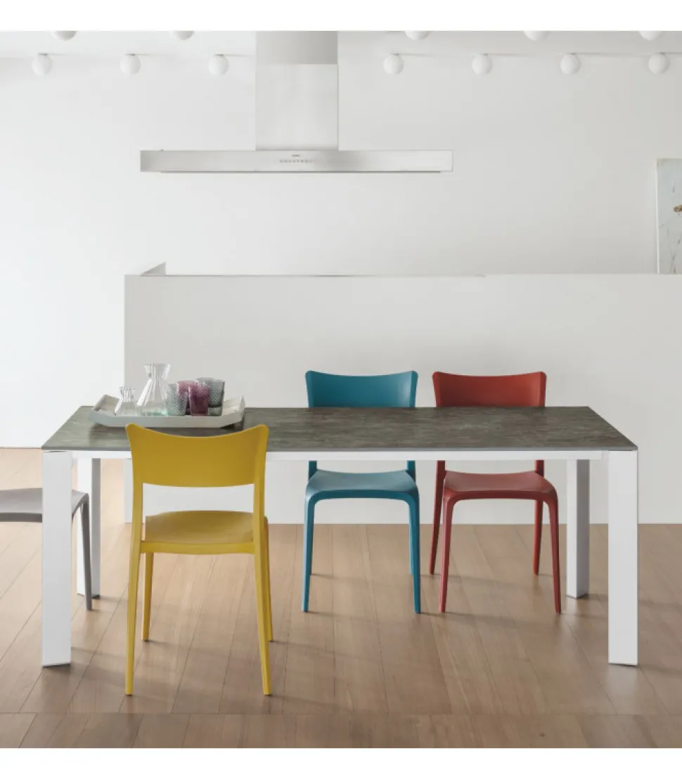 Saturno 160, E Un Tavolo Allungabile In Alluminio Con Gambe In Metallo Verniciato. Piano In Gres Porcellanato O Vetro Temperato, Con Allunghe In Mdf Laccato In Tinta Con La Struttura, Oppure Piano In Laminato Effetto Legno, Laminato Effetto Malta O Hpl. Saturno Gode Di Una Linea Particolarmente Raffinata. E Ottimo Sia Per La Sala Da Pranzo Che Per La Zona Giorno.