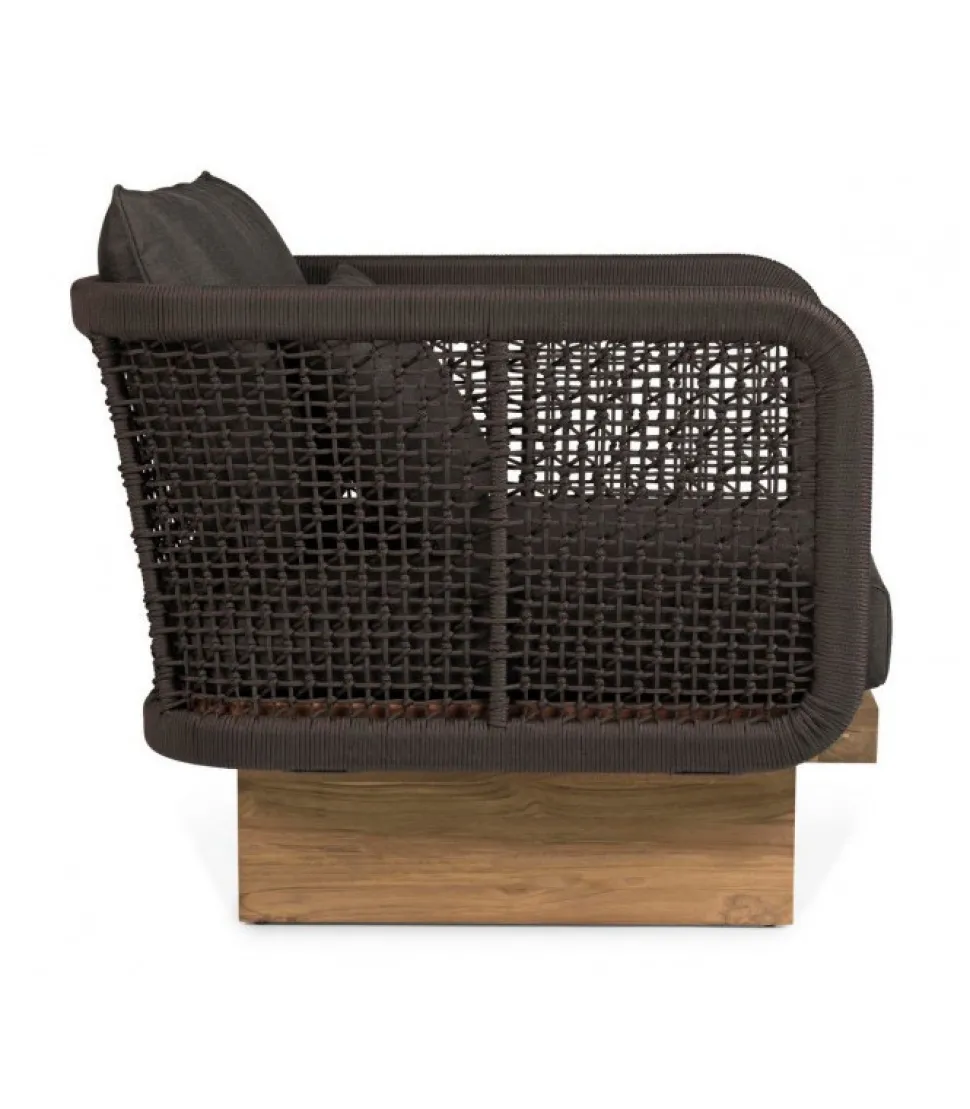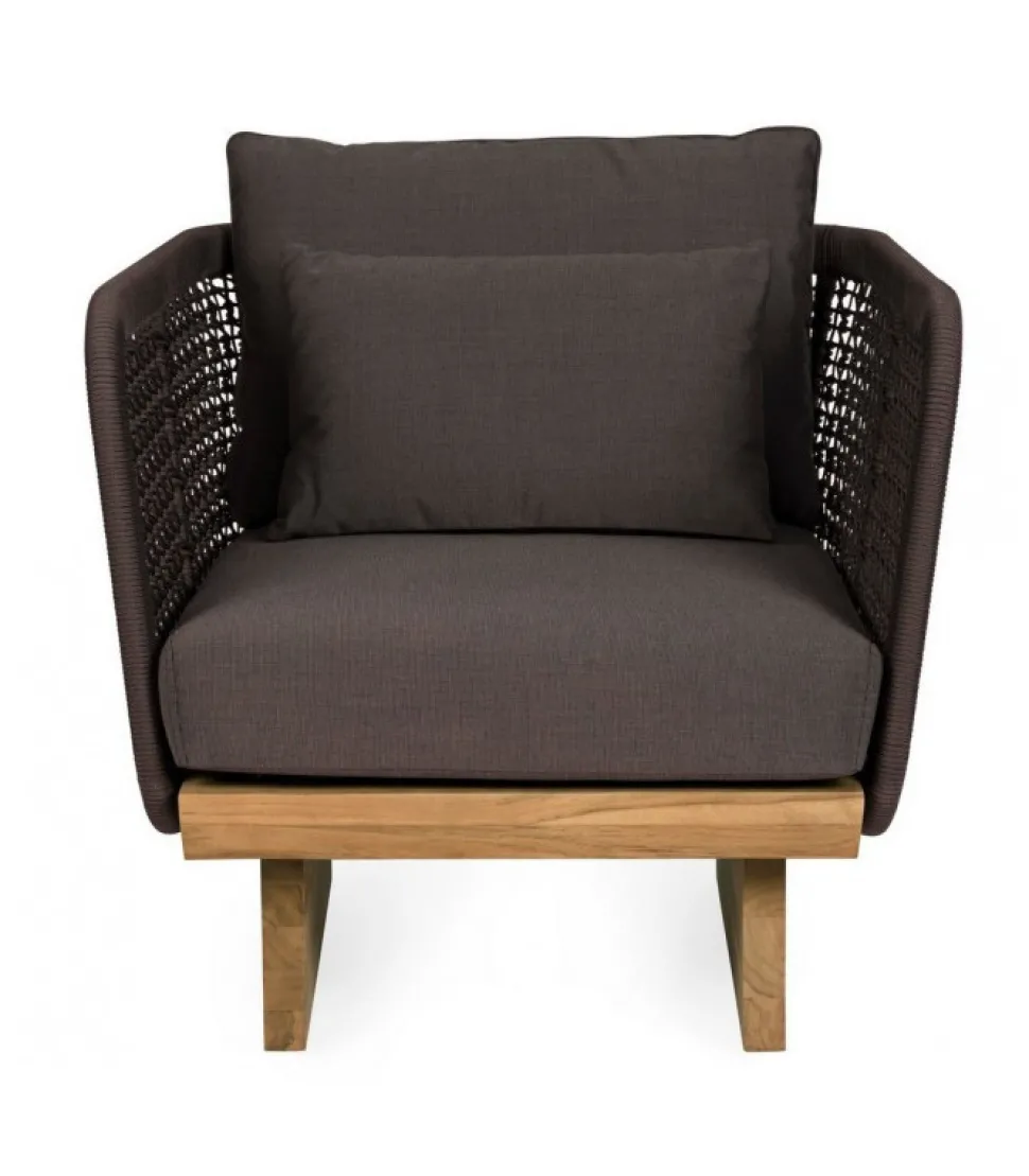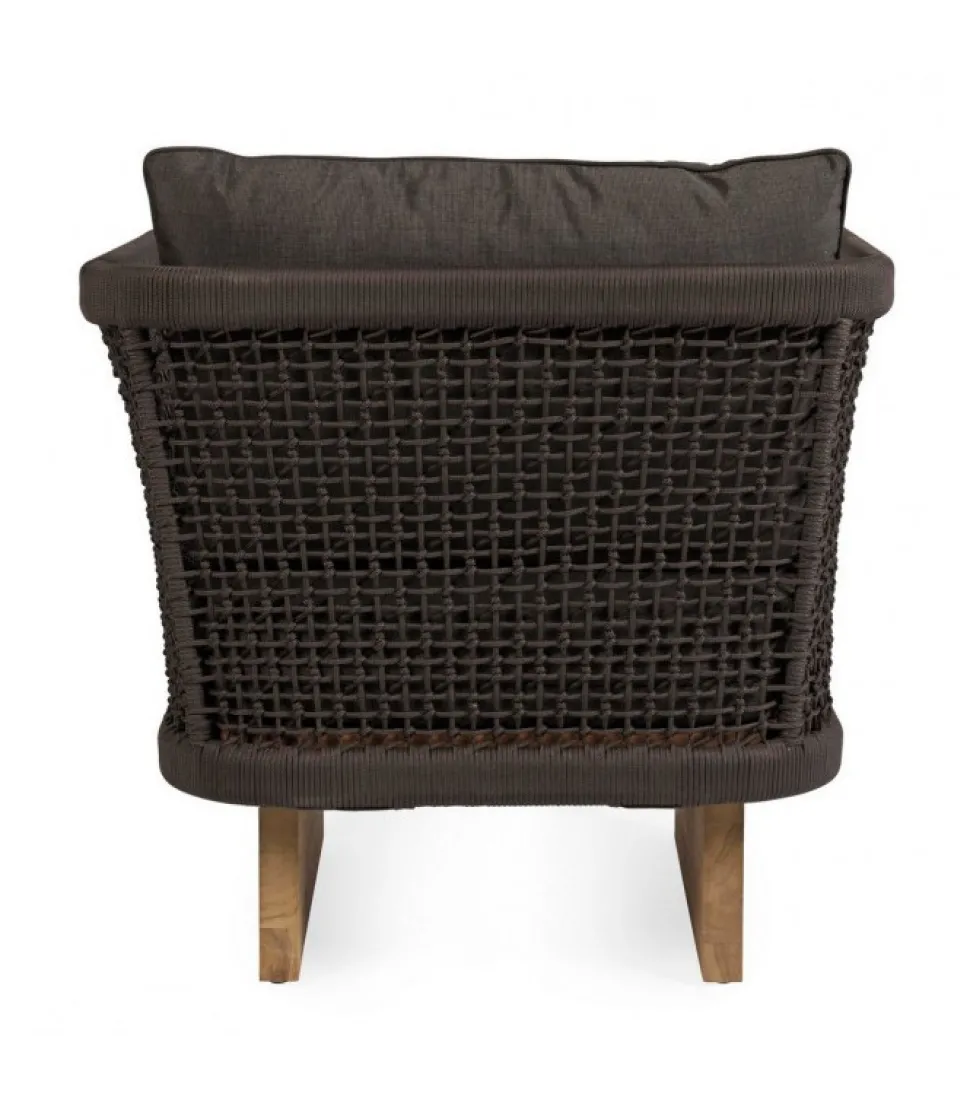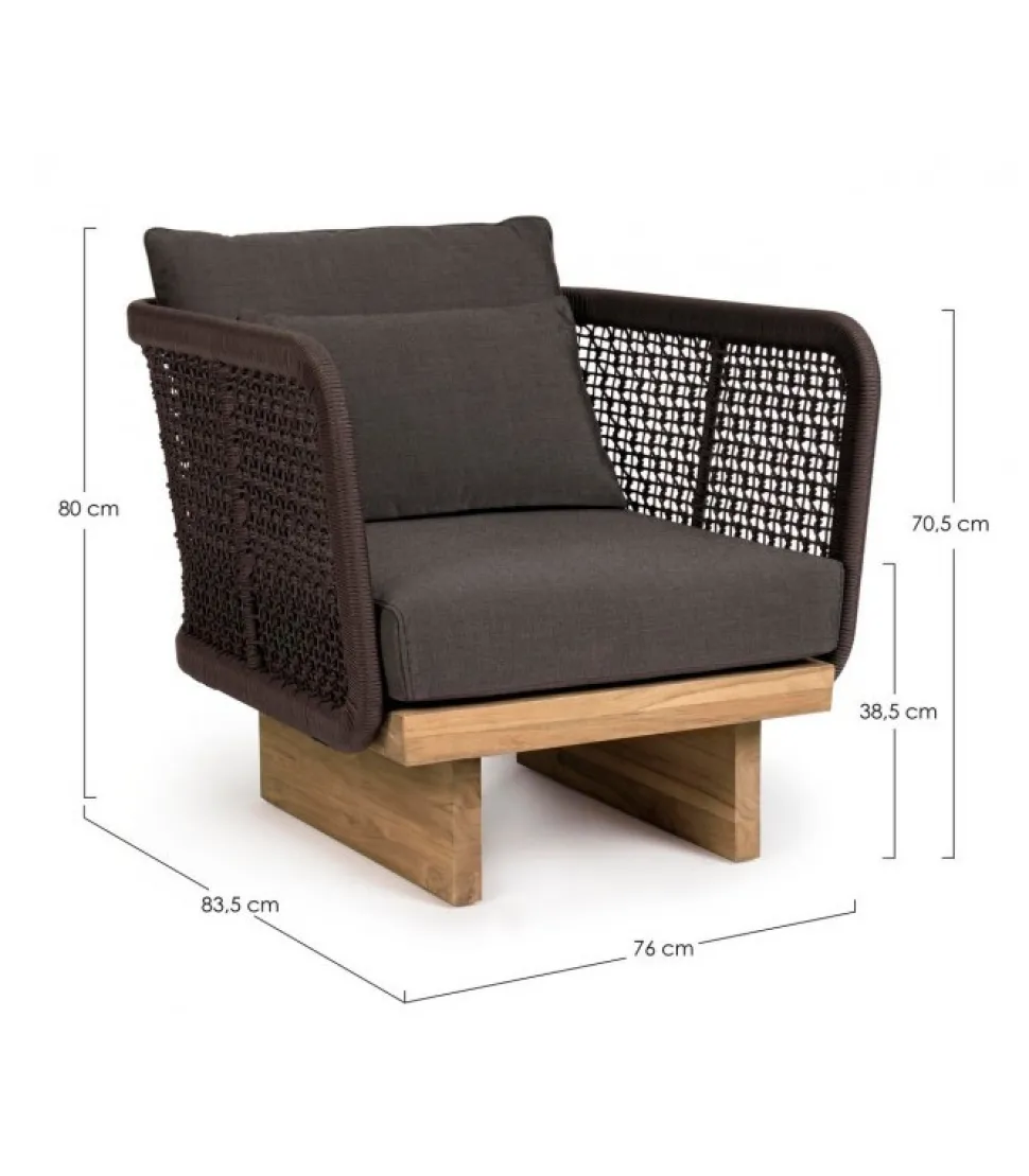 Poltrona C-C Xylia Dark Struttura In Alluminio Verniciata A Polvere (Poliestere). Seduta E Gambe In Teak – Svlk (Legno Certificato Proveniente Da Foreste Sostenibili) Con Finitura Rustica. Intreccio Per Esterno In Corda (Polipropilene), Idrorepellente E Resistente Ai Raggi Uv.Cuscini Sfoderabili Con Tessuto Sunbrella (100% Acrilico), Idrorepellenti E Resistenti Ai Raggi Uv. Imbottitura Per Esterno Quick Dry Foam (Antiumidita’). – Dimensioni In Cm. 76 (L.) 83.5 (P.) 80 H – 38.5 ( H1) 70.5 H2